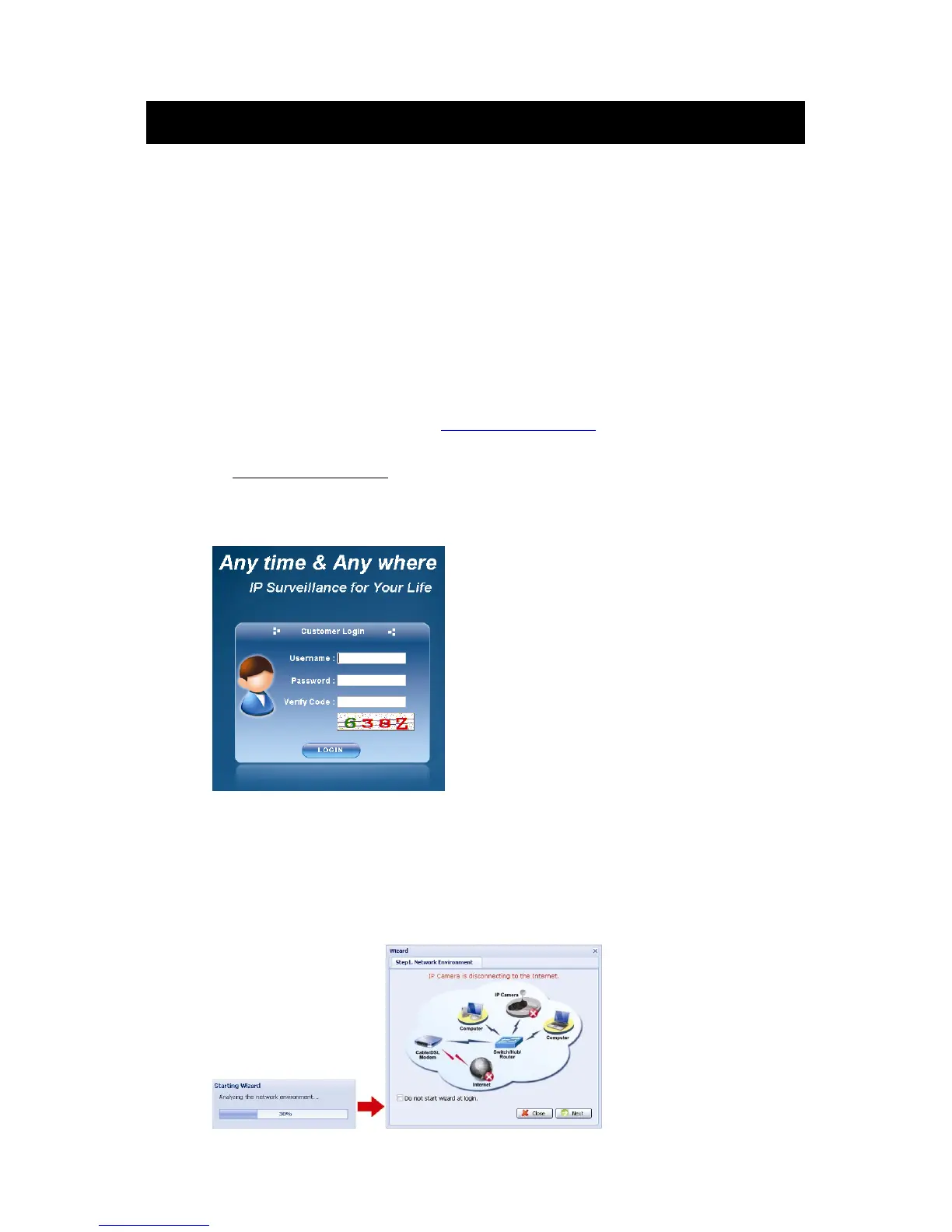‧ To directly access the camera live view without starting the wizard for the login next time, check “Do not start