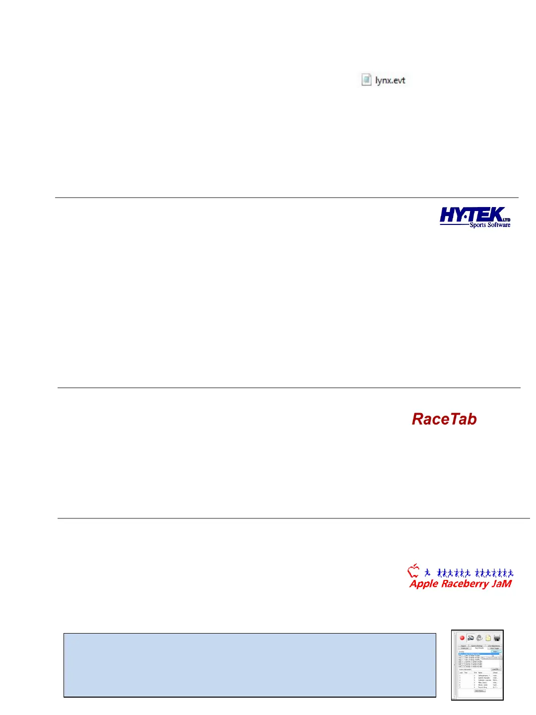 management software (Hy-Tek, Race Tab, RaceberryJaM, etc.) and imported into Eagle Eye Pro