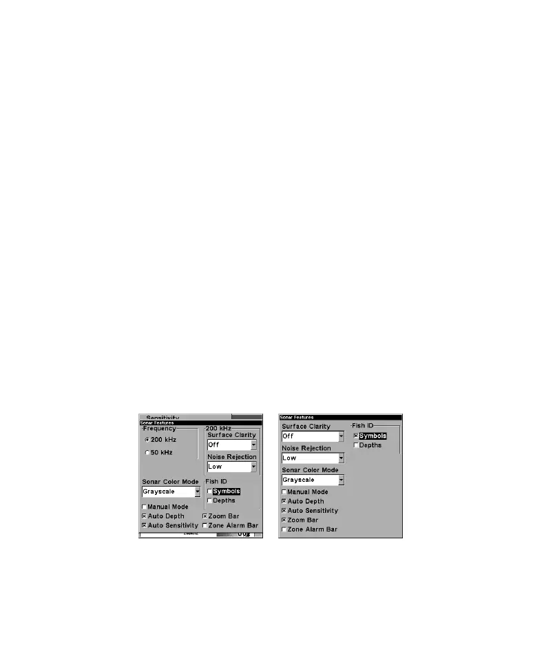 Sonar Features menu with Fish I.D. Symbols selected (at left, dual-
