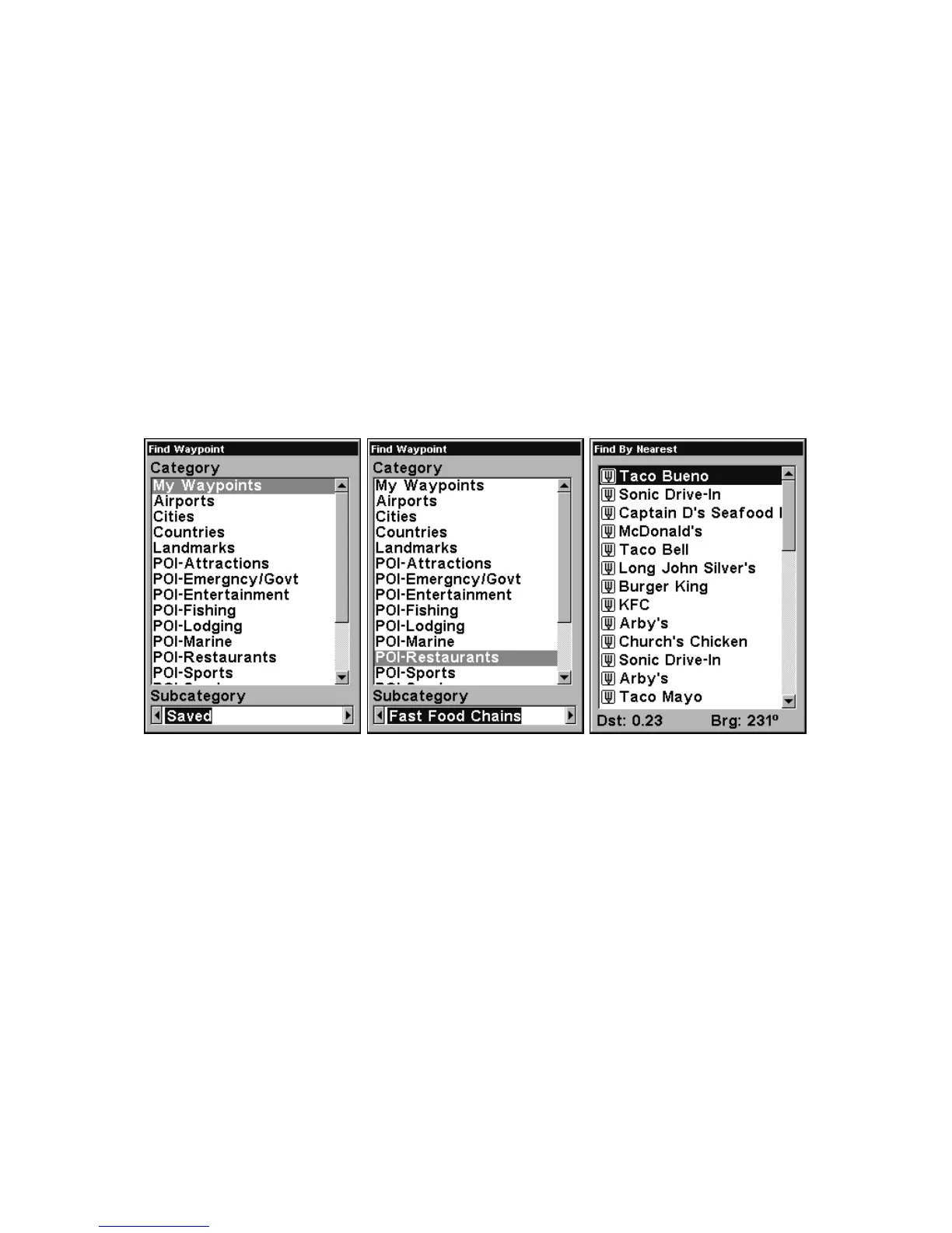 Find Waypoint Menu, left; Category Selection menu, center; and list of