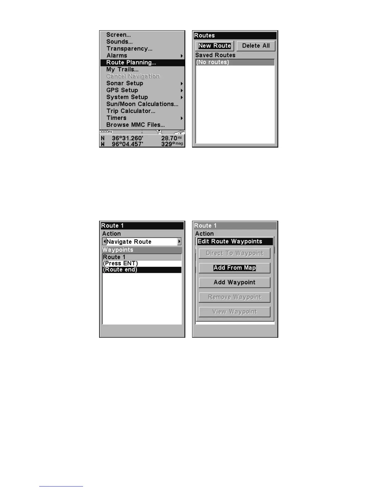 Edit Route menu, left. Edit Route Waypoints menu, right,