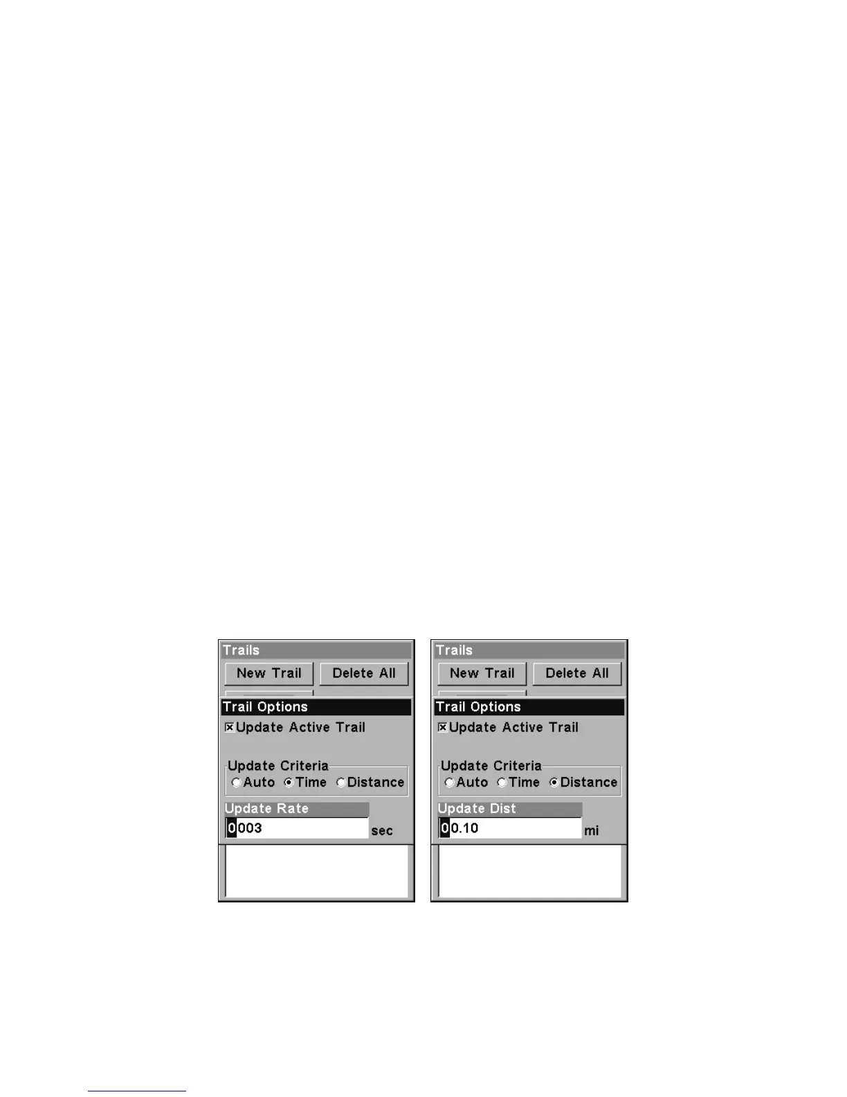 Trail Options menu: Update Time Rate setting, left, and Update Dis-