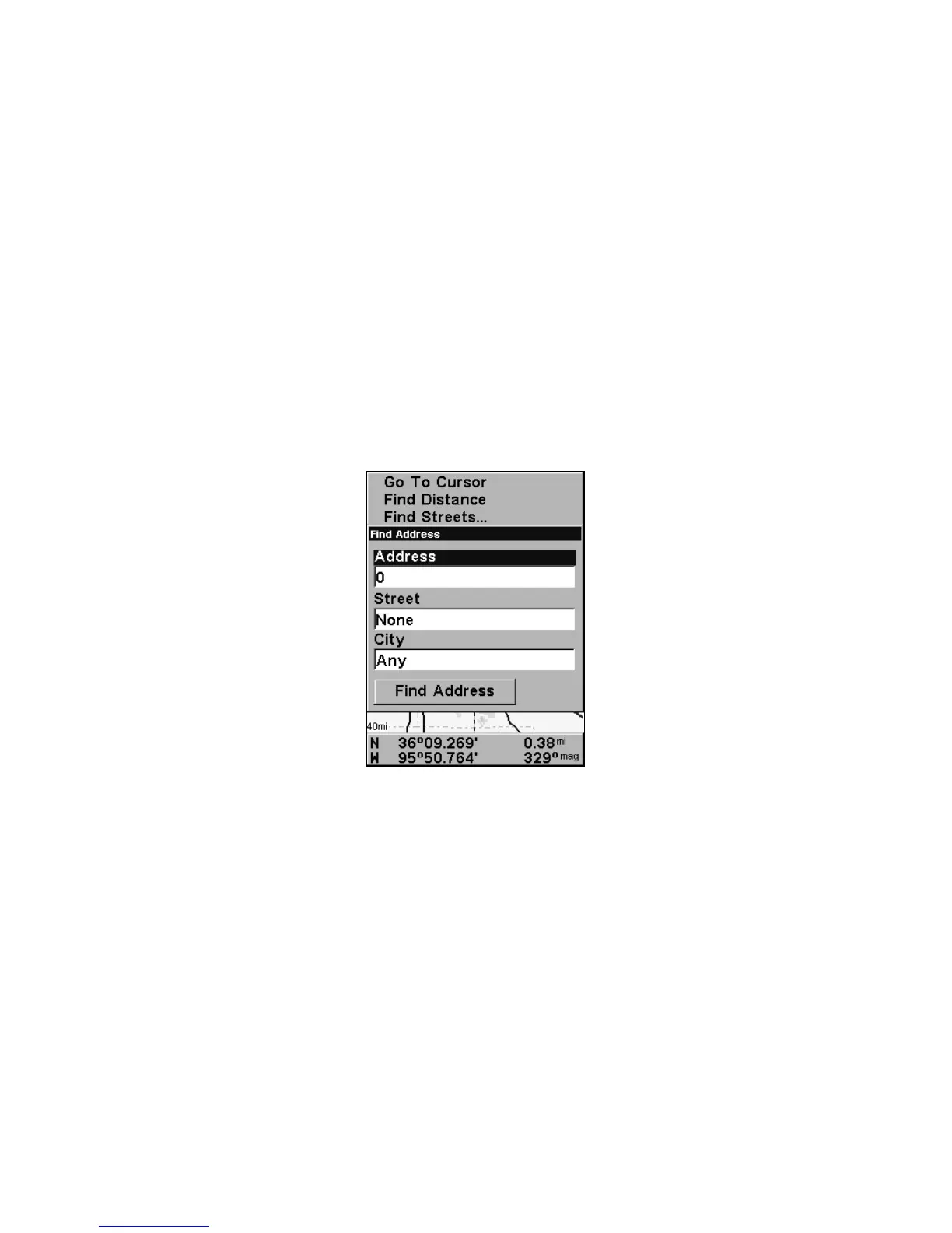 1. From the Map Page, press MENU|↓ to FIND ADDRESS|ENT.