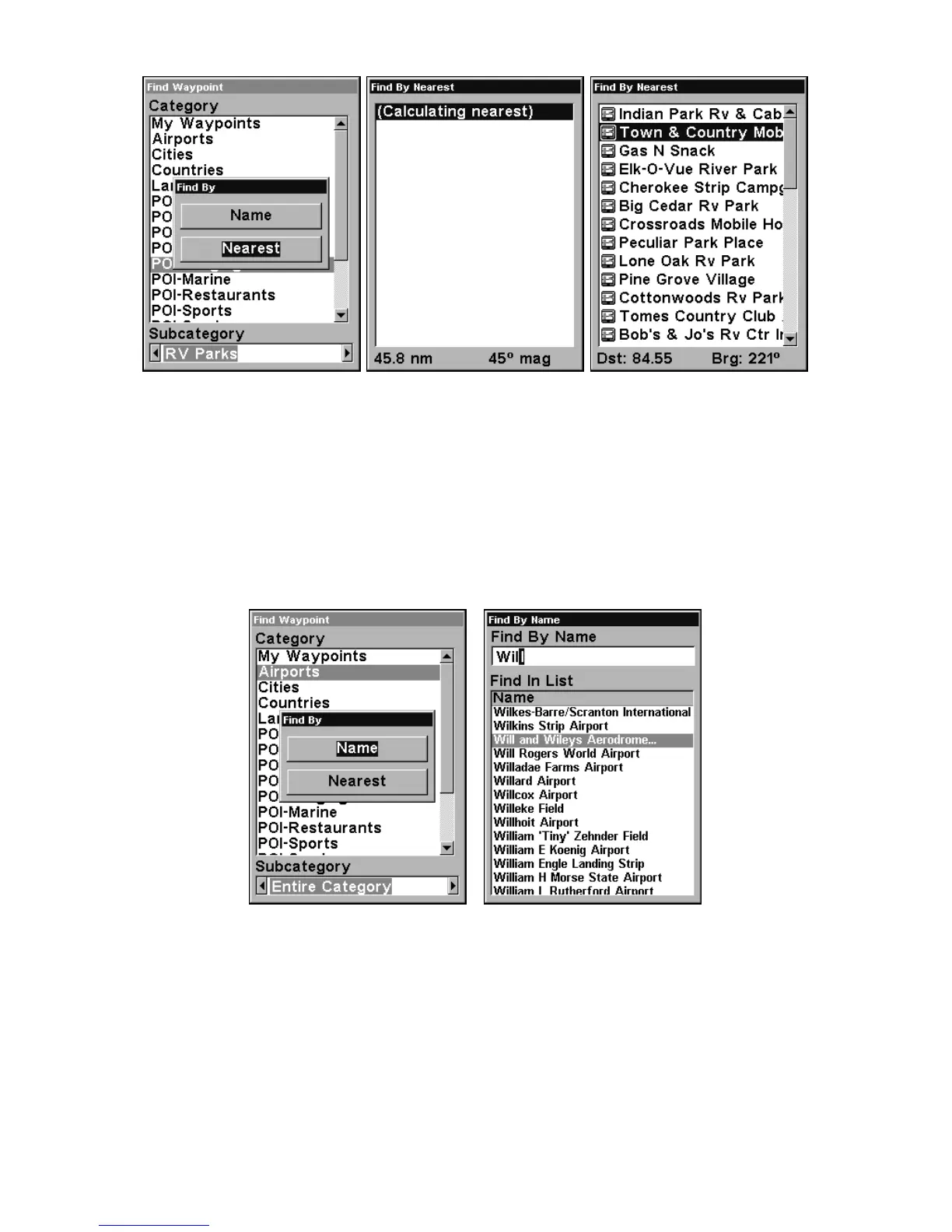 Find by Nearest option, left, Calculating screen, center, POI list, right.
