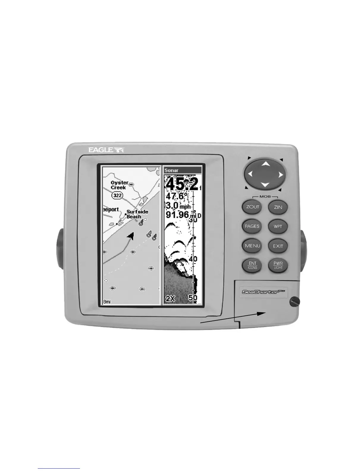 SeaCharter 500CDF sonar/GPS unit, front view, showing map with so-