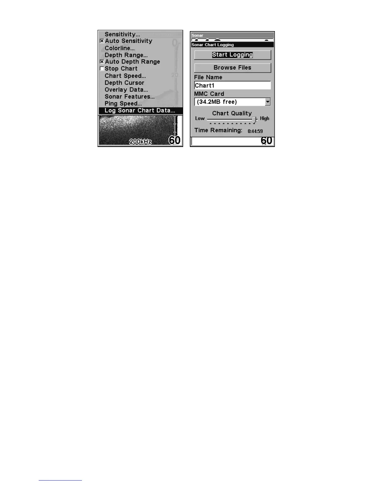 selected. At right, Sonar Chart Logging menu, with the Start Logging