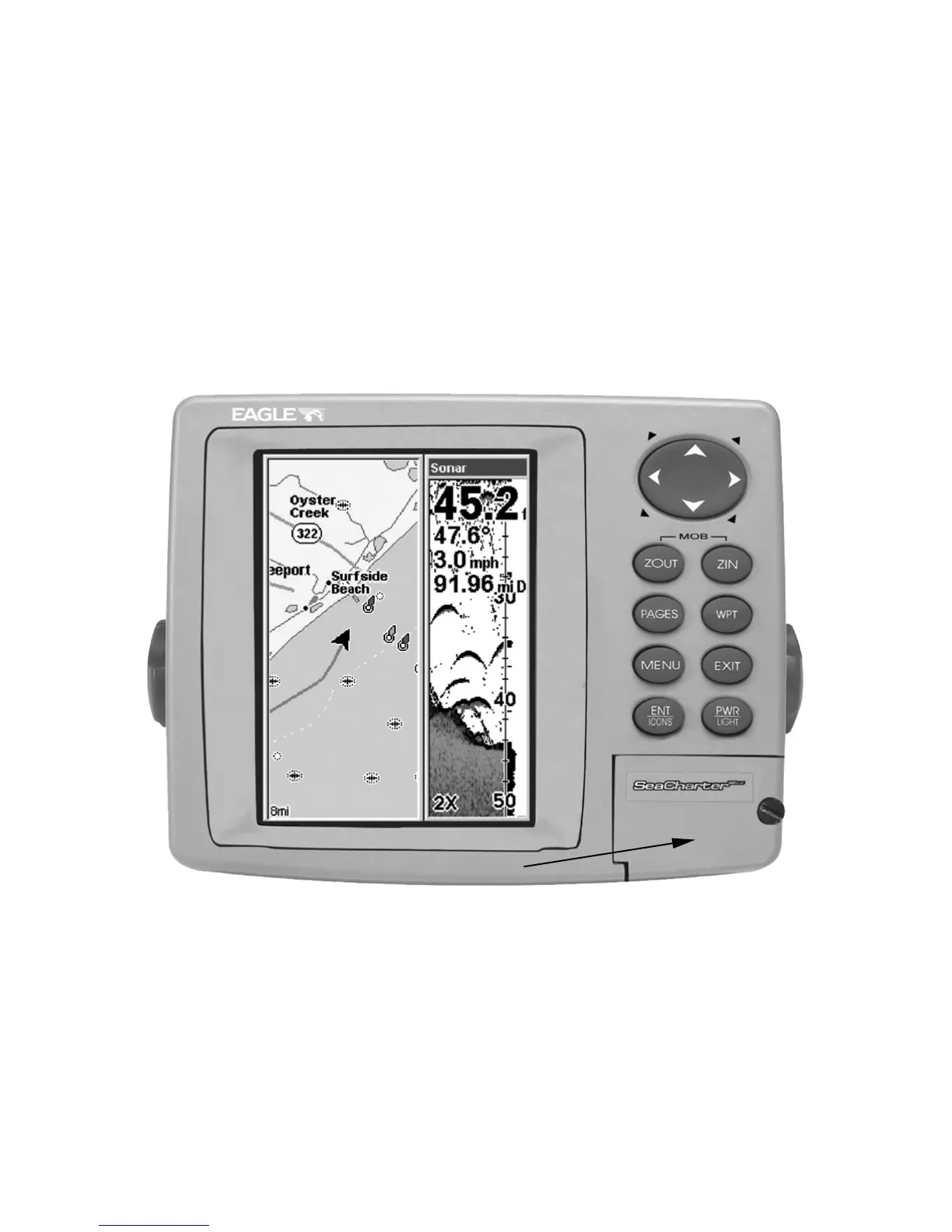 SeaCharter 500CDF sonar/GPS unit, front view, showing map with so-