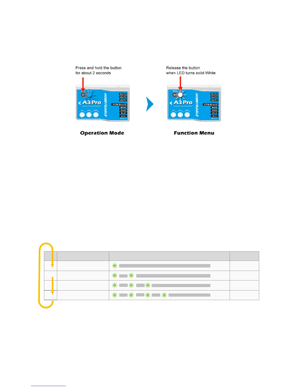 reach the function that you wish to operate in, short press the button to perform it. After the process is completed the gyro