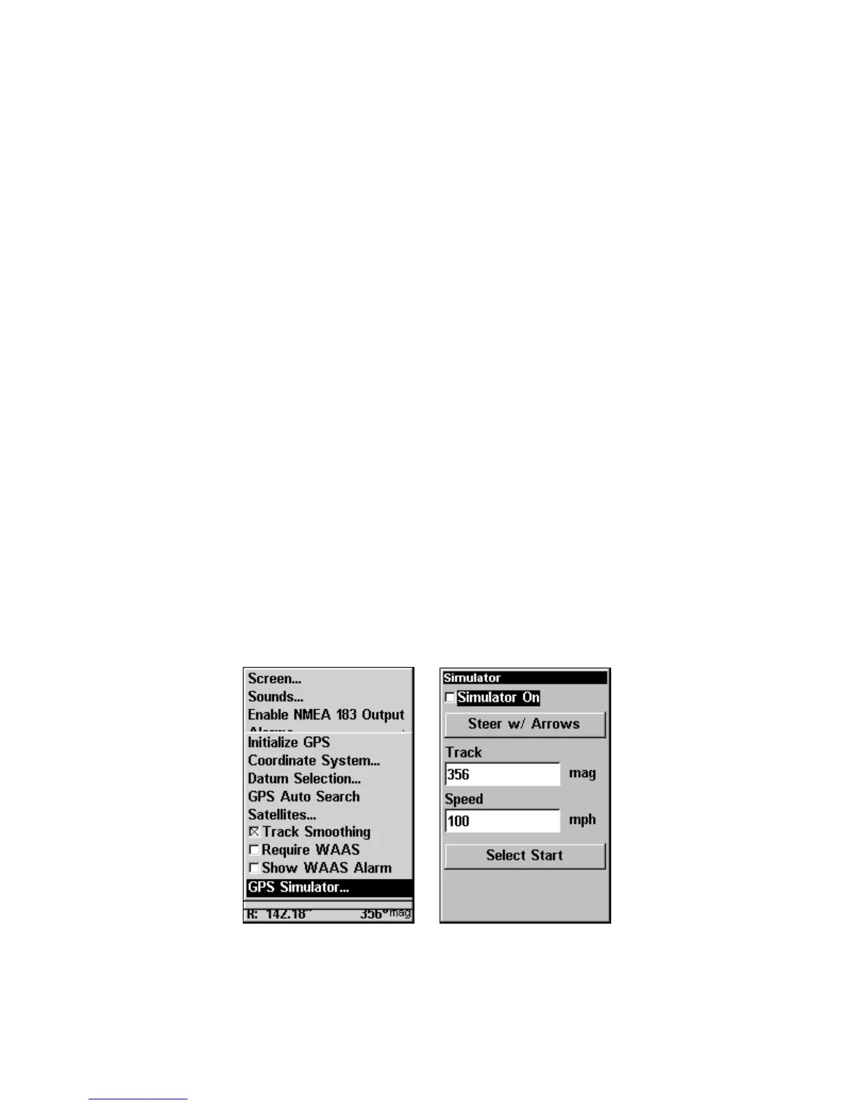 GPS Setup Menu (left) with GPS Simulator menu (right).