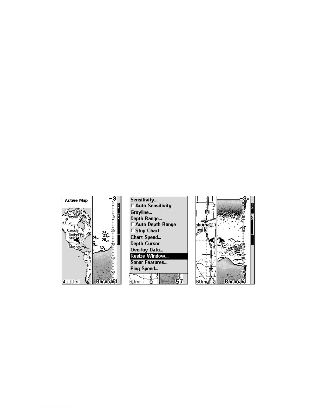 Map with Sonar page (left). Resize Window command selected from