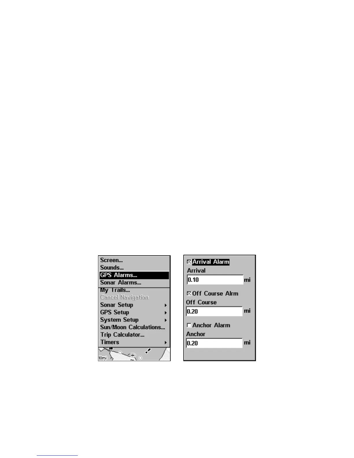 Alarms command (left); GPS alarm menu (right) with Arrival Alarm