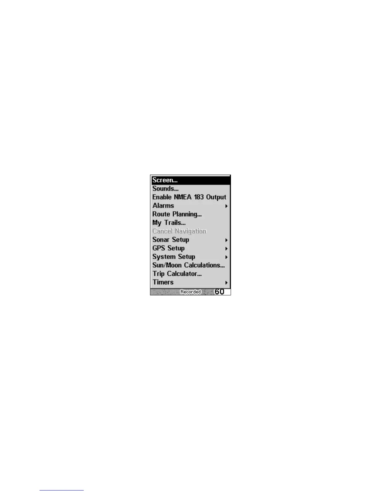 Alarms: turns GPS or sonar alarms on or off and changes alarm