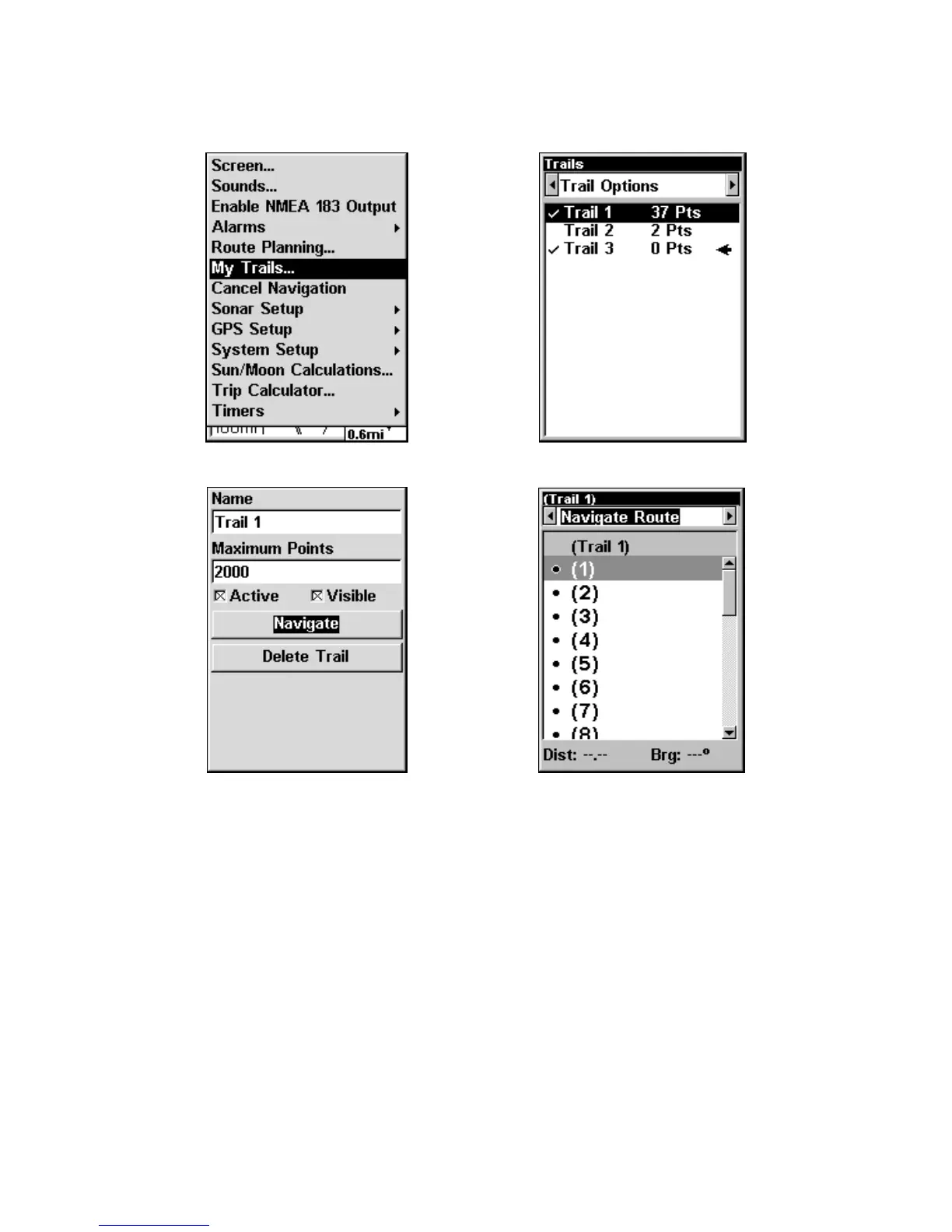 Trails Menu. Fig. 3, Edit Trail Menu. Fig. 4, Edit Route Menu with