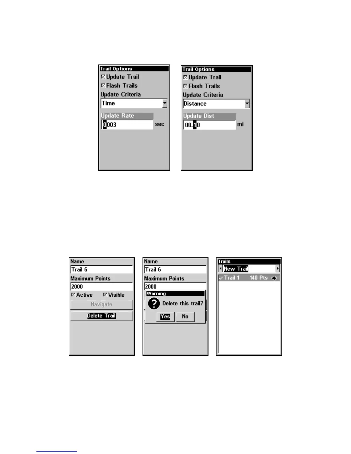 Trail Options menu with Update Rate setting (left)