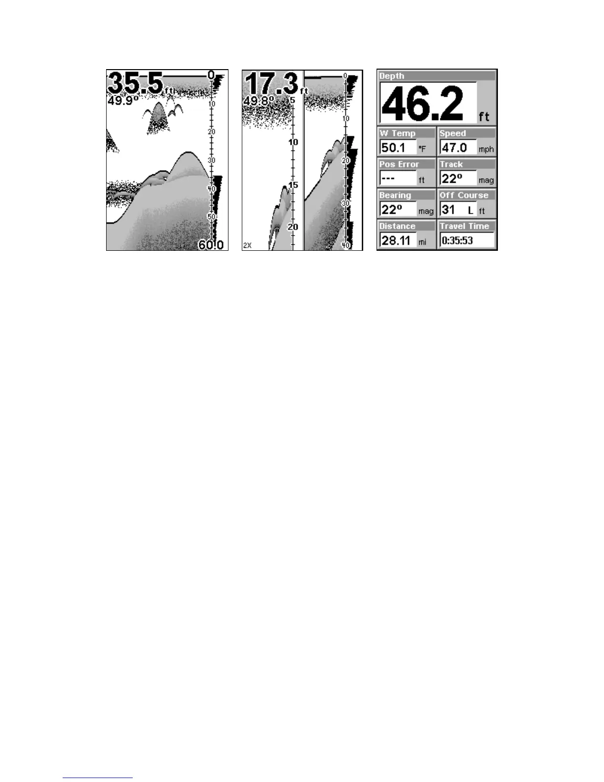 Full sonar chart (left); split zoom (center); Digital data (right).