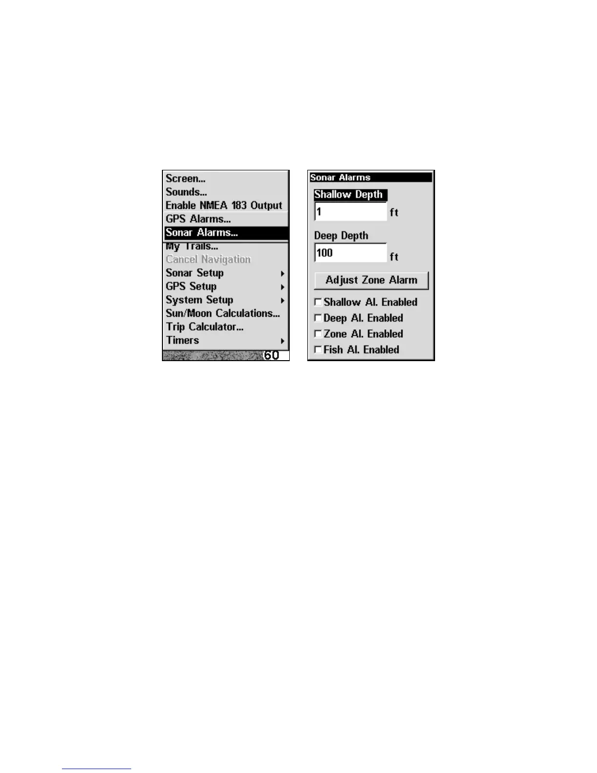 To switch to a different depth setting, open the Sonar Alarms menu and