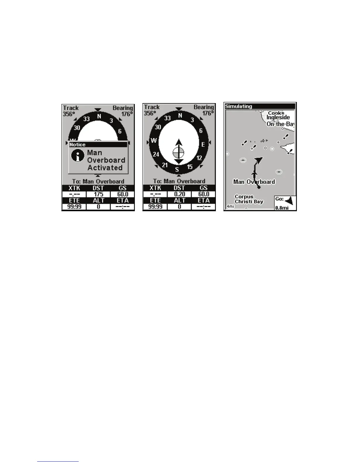 Navigating to Man Overboard: Man Overboard activated (left), Naviga-