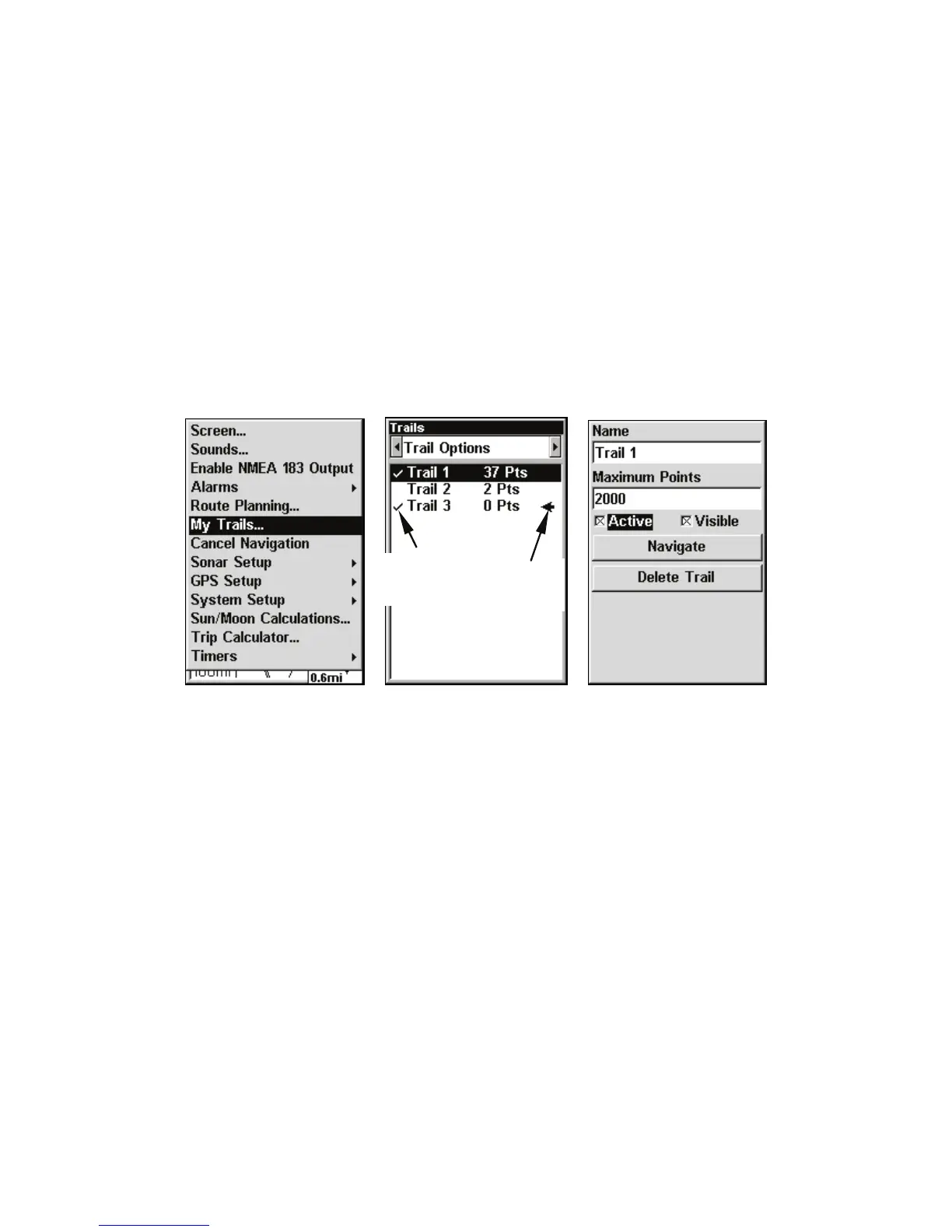 mand (left). The Trails Menu (center). The arrow to the right of Trail 3