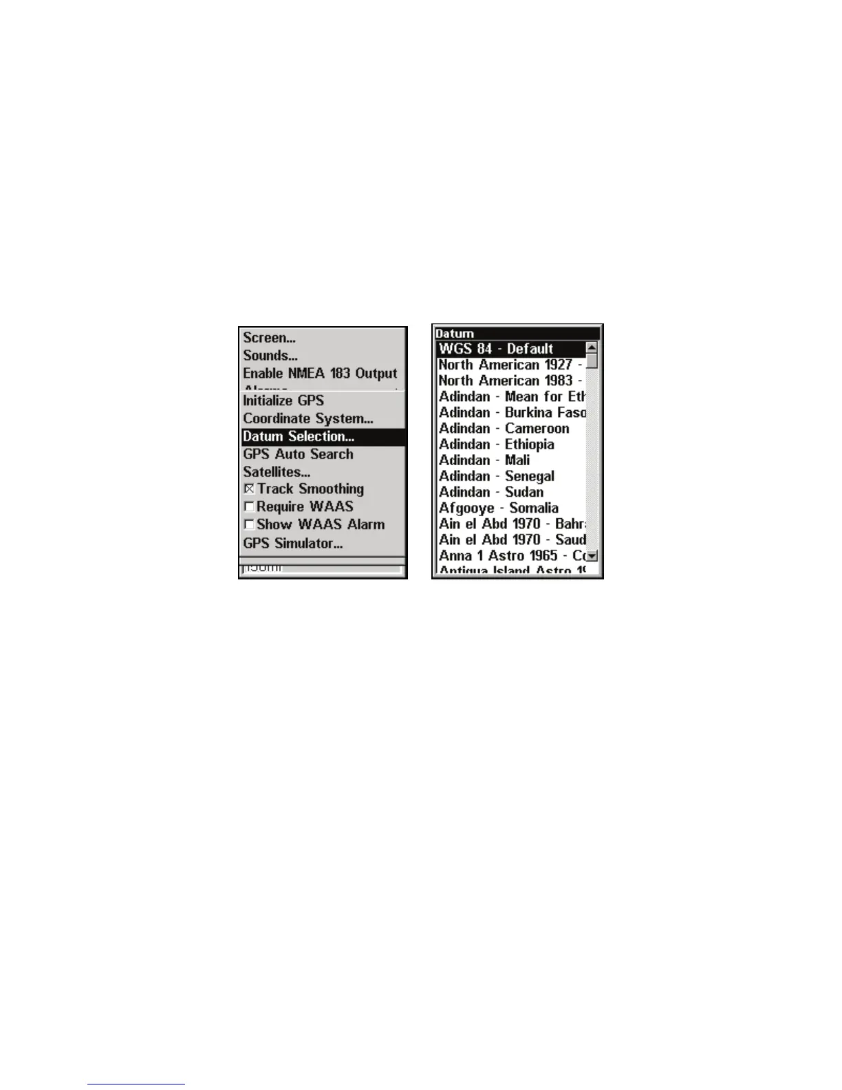 GPS Setup Menu (left) with Map Datum Menu (right).
