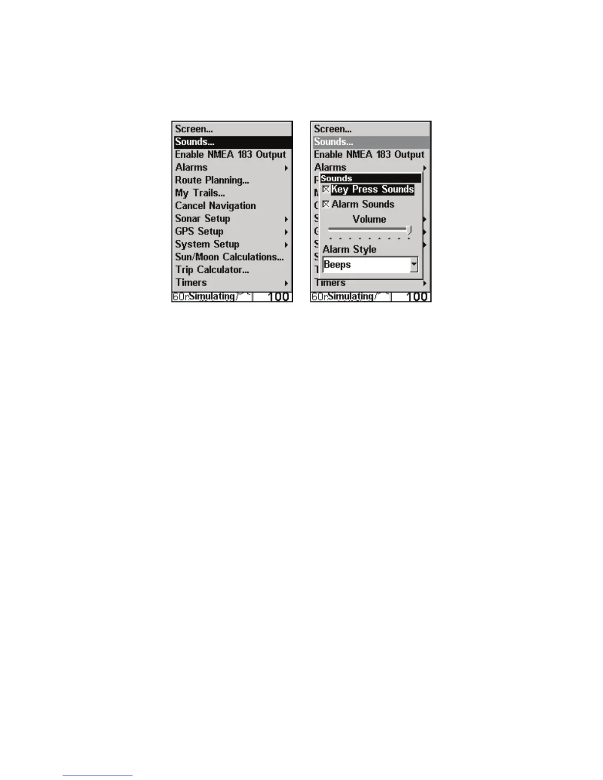 Sounds command (left). The Sounds menu (right).