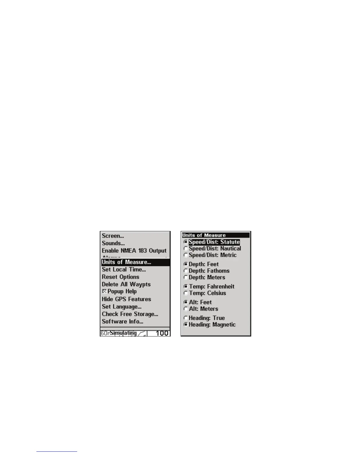 This menu sets the units of measure used