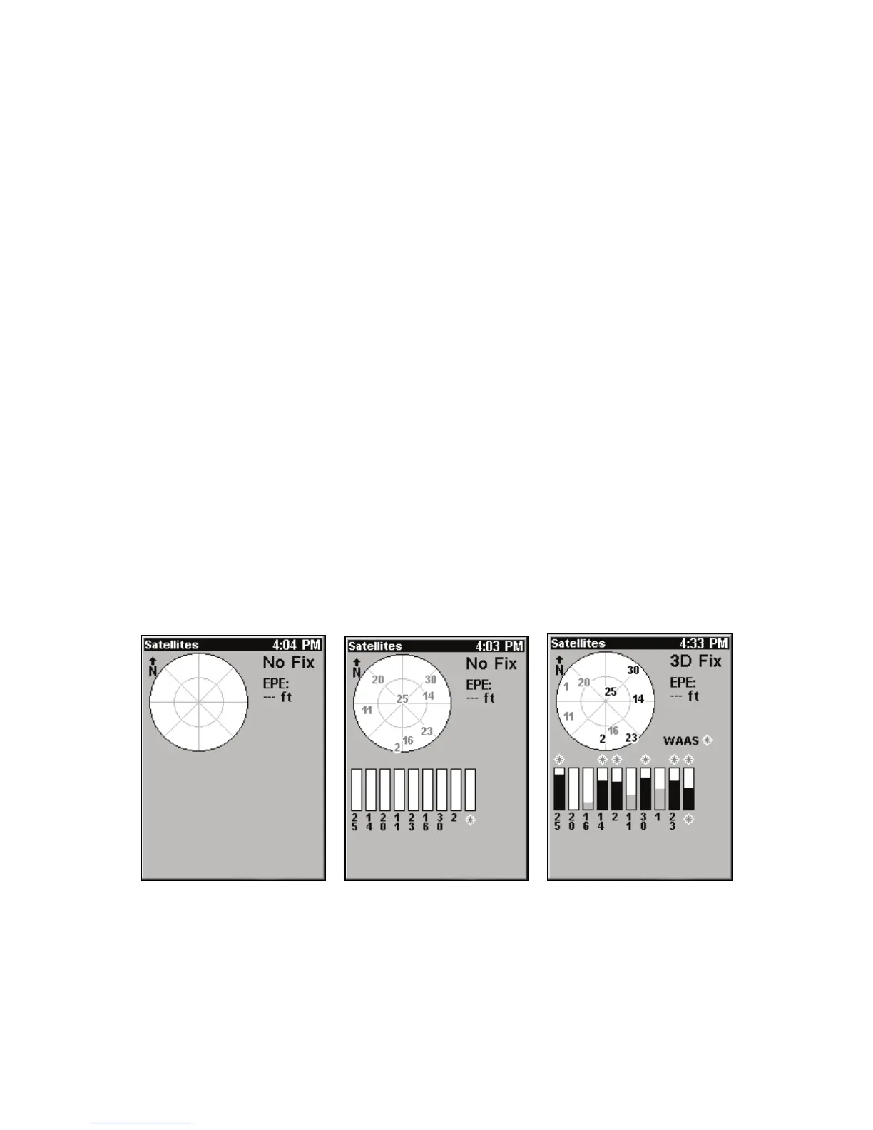 Satellite Page. First page (left) indicates unit has not locked on to any