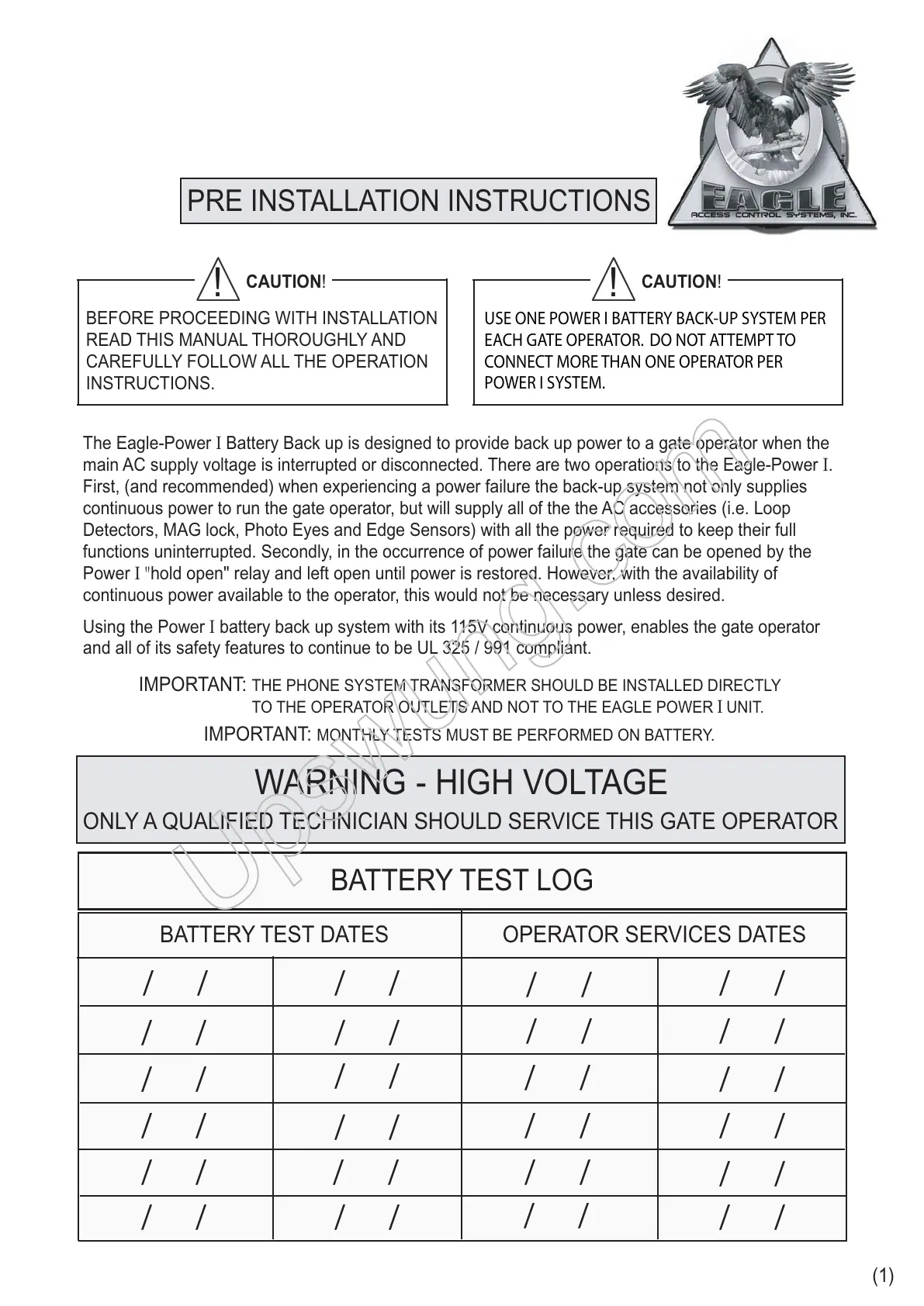 The Eagle-Power I Battery Back up is designed to provide back up power to a gate operator when the