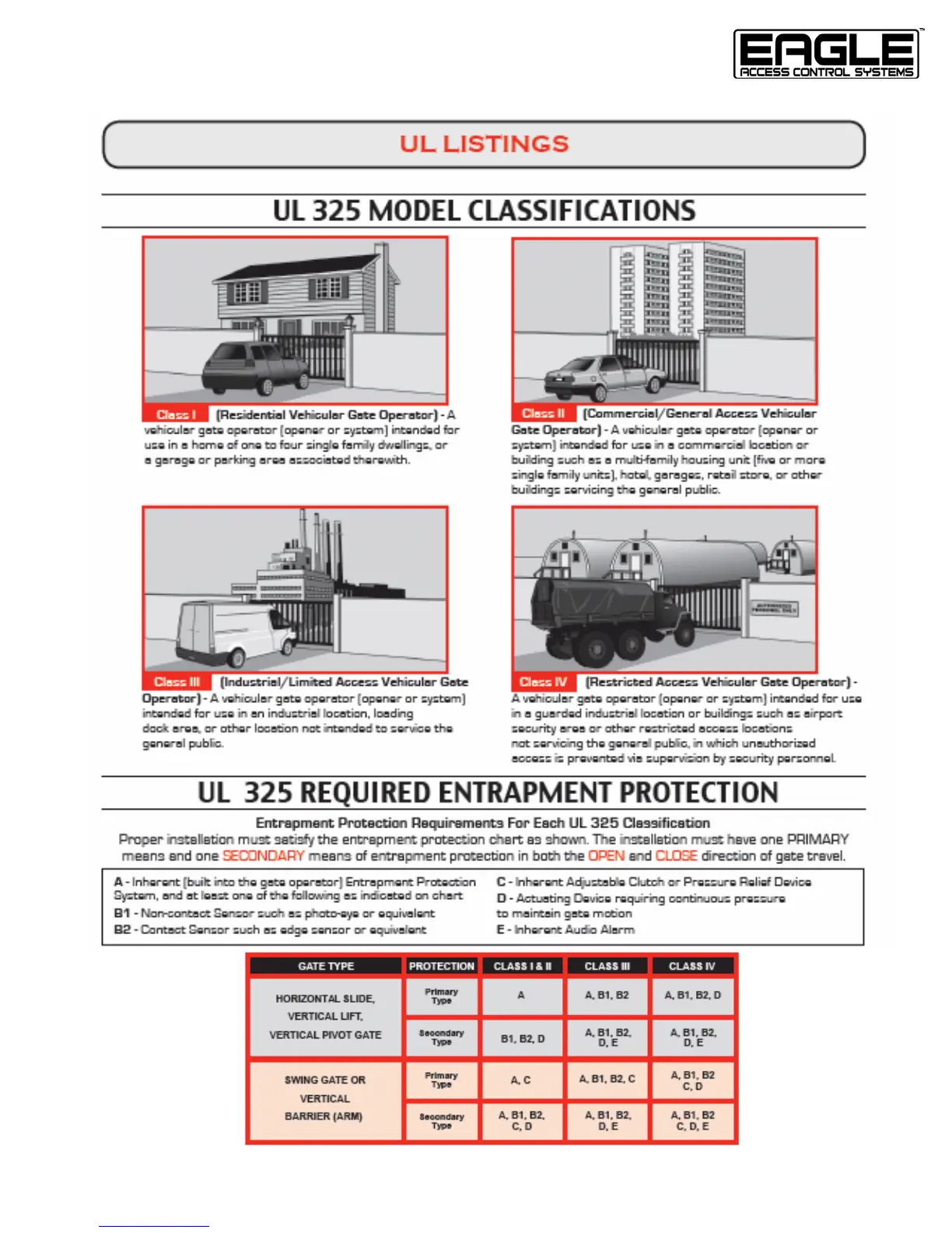 Eagle Eagle-E7 - UL 325 Model Classifications; UL 325 Required Entrapment Protection