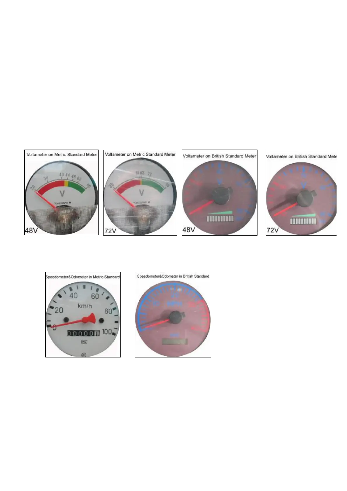 Voltameter—— Indicate the voltage of battery. On Metric Standard Meter, it ranges from 20V to 60V (for 48V