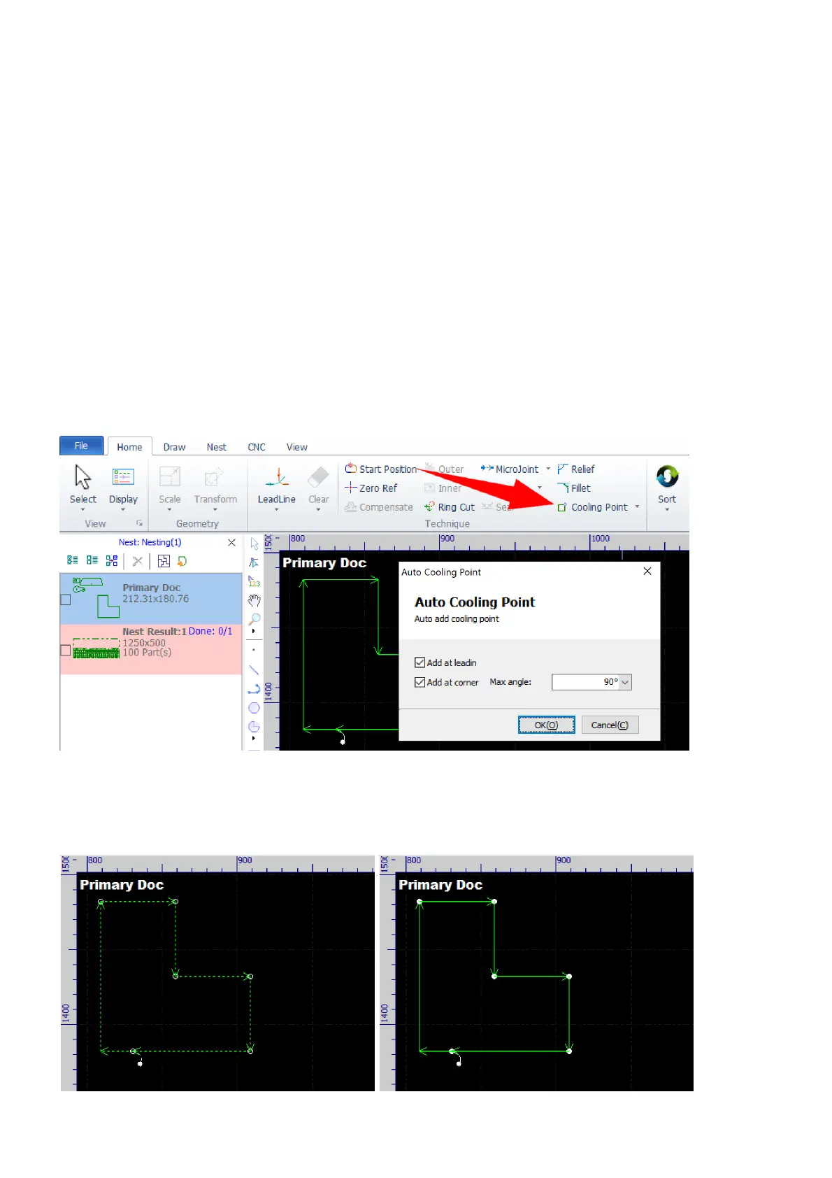check the option Add at corner if you want to set cooling points at sharp corners and set the angle range in