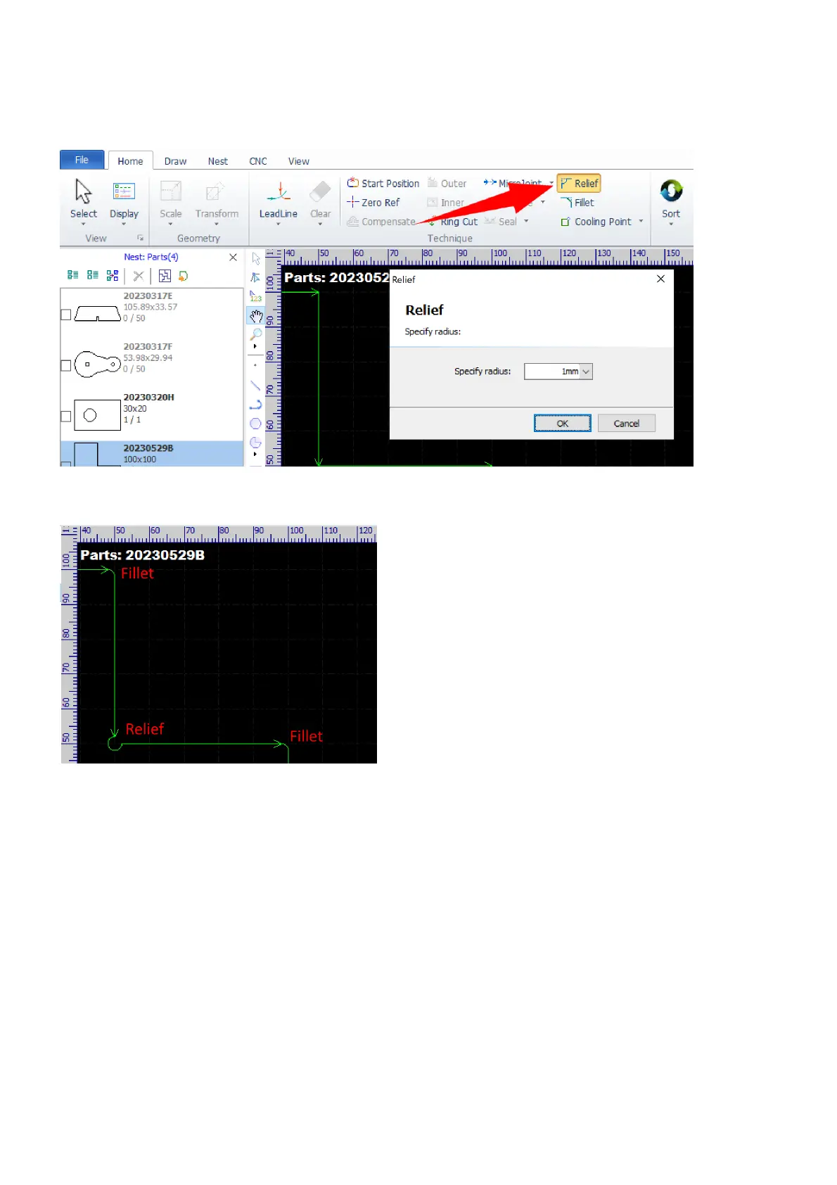 Set the radius of relieves in the pop-up dialog and then click on the corners you want to process.