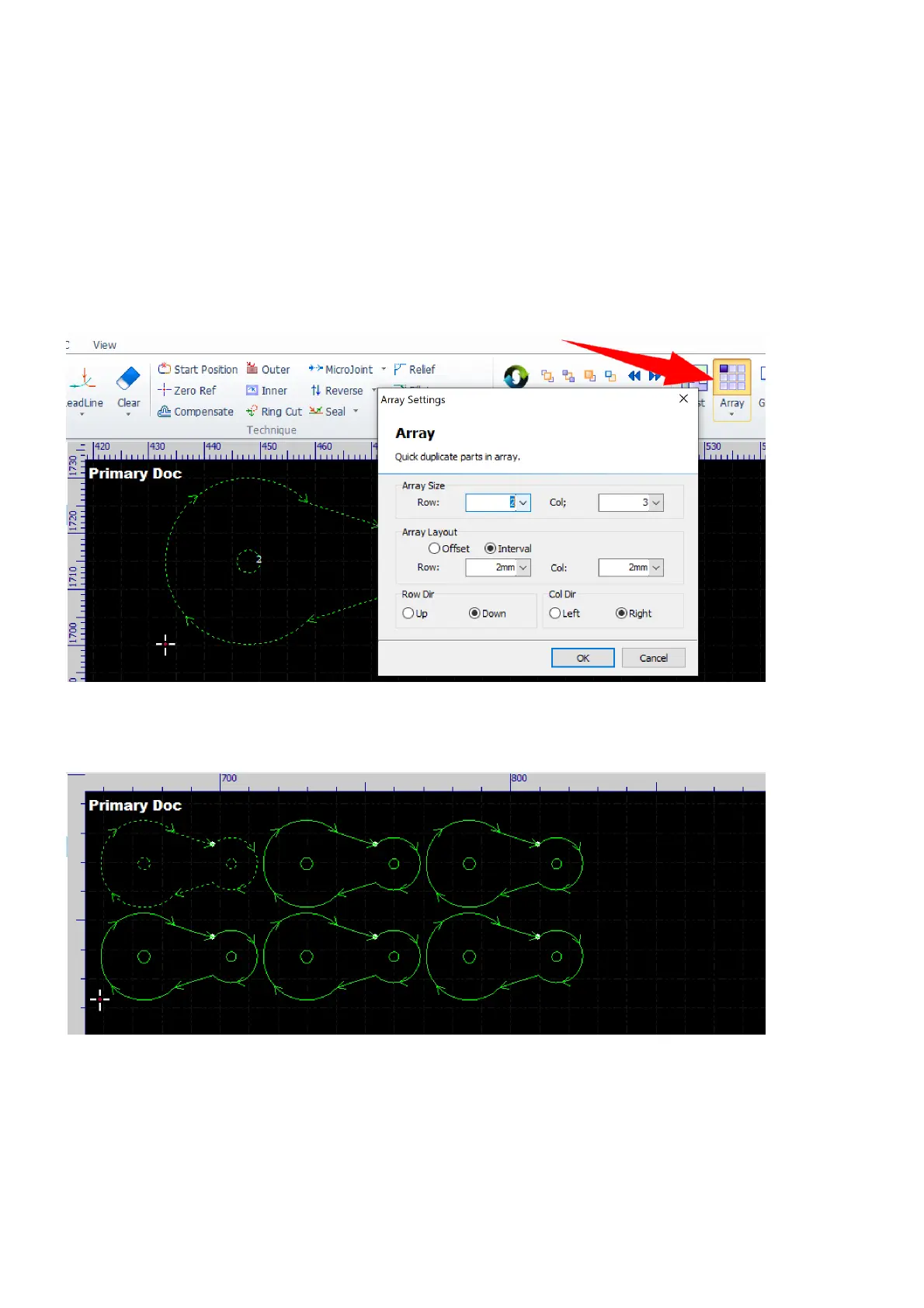 CypCut has a set of commands for the array function, i.e. Rectangular Array, Dynamic Array, Circular Array