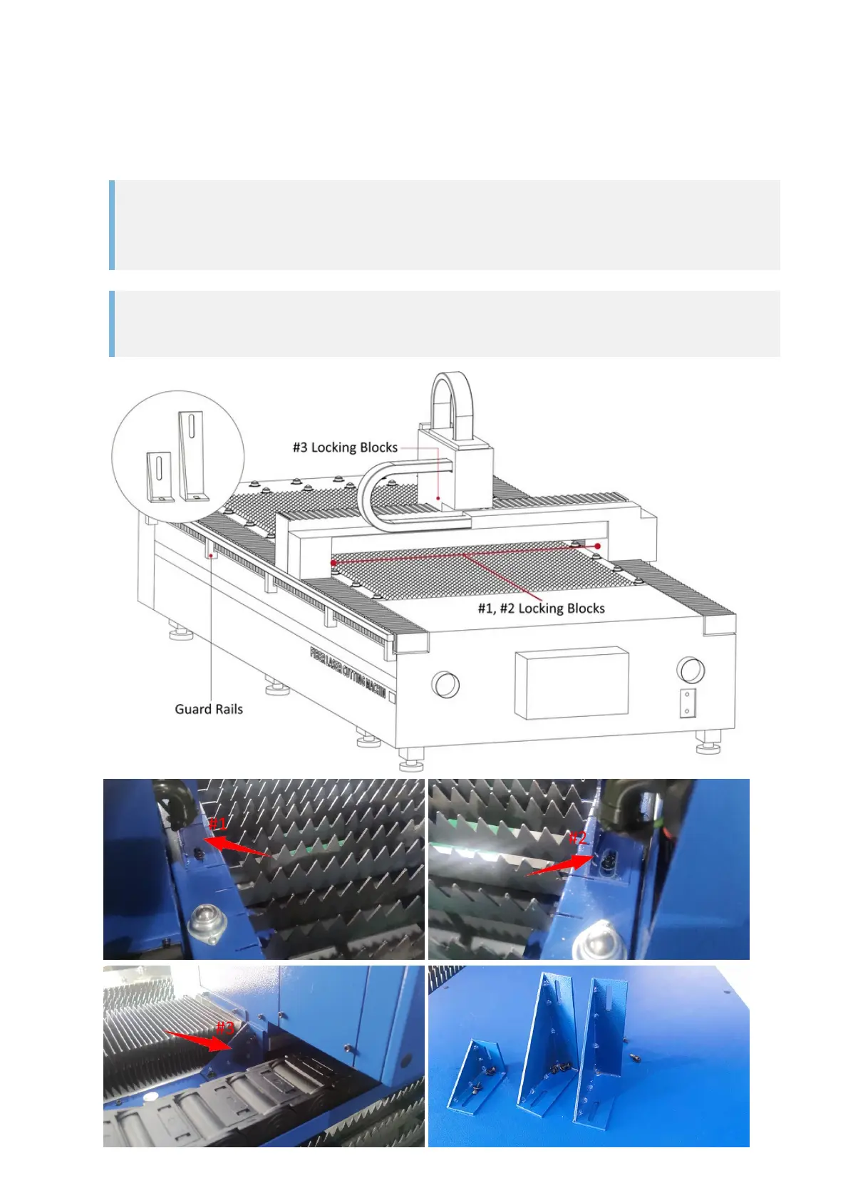 The machine will DAMAGE itself if the laser head starts moving while the locking blocks are still