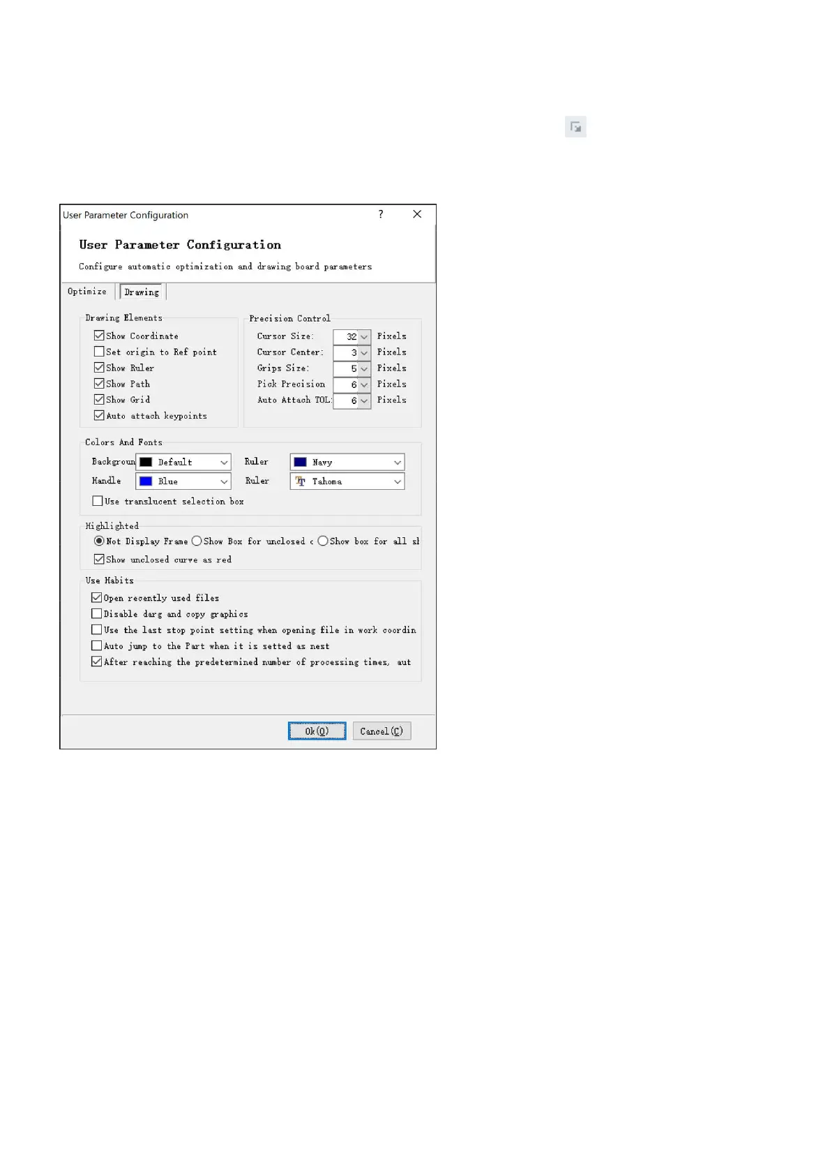 Here you can set which elements to display in the drawing window, set size of cursor, set background color of
