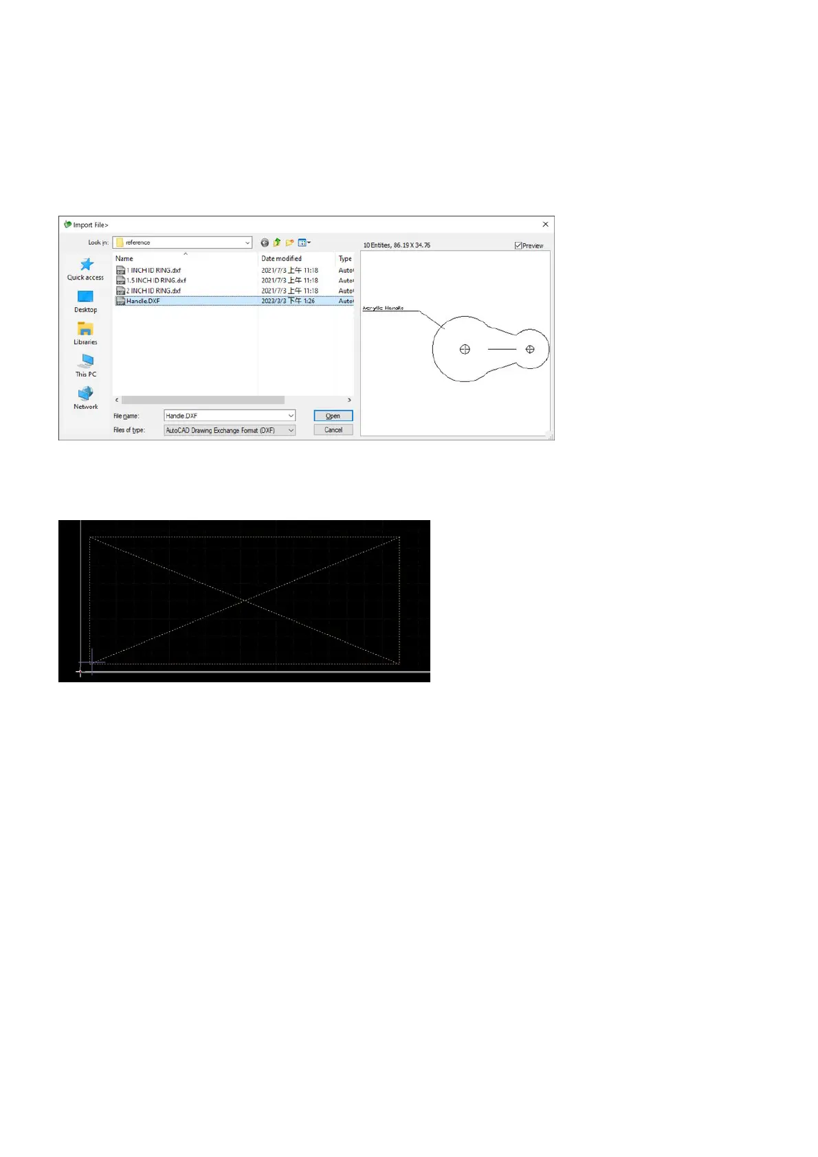 Let's go through the steps for importing a DXF file into the drawing window. Importing other files works just