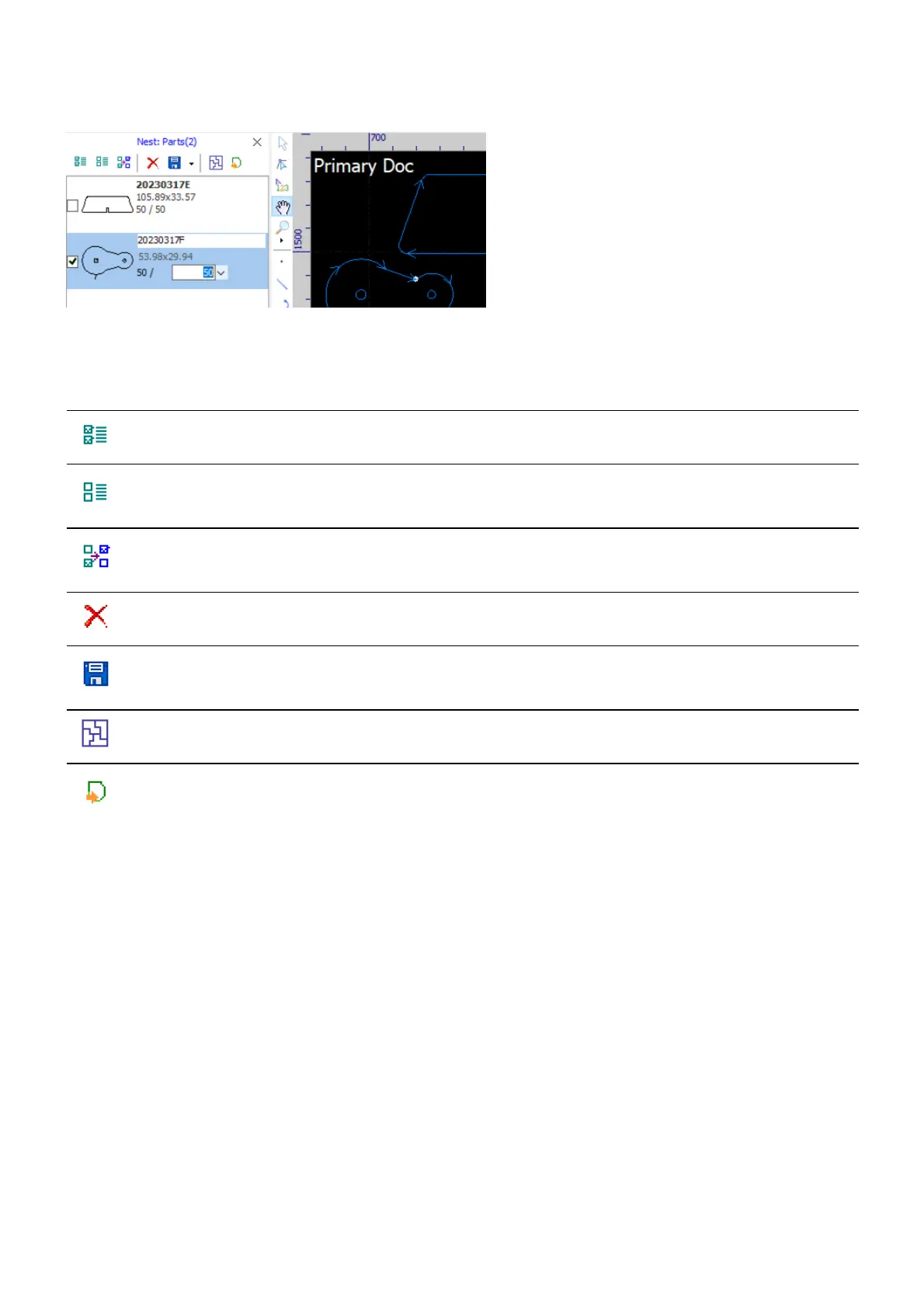 There is a toolbar in the panel to help you manage the parts and do nesting.