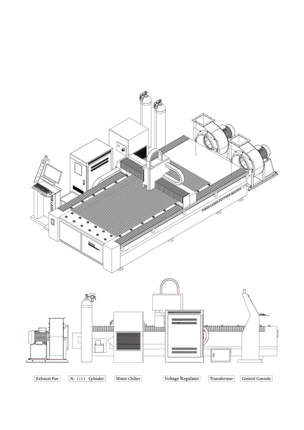 The EV-30 industrial fiber laser cutting system is composed of a machine, a control console, a fiber laser (pre-