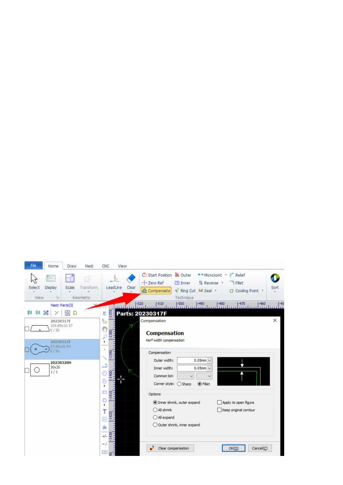 Select the contours, and then select the command Compensate in Home.