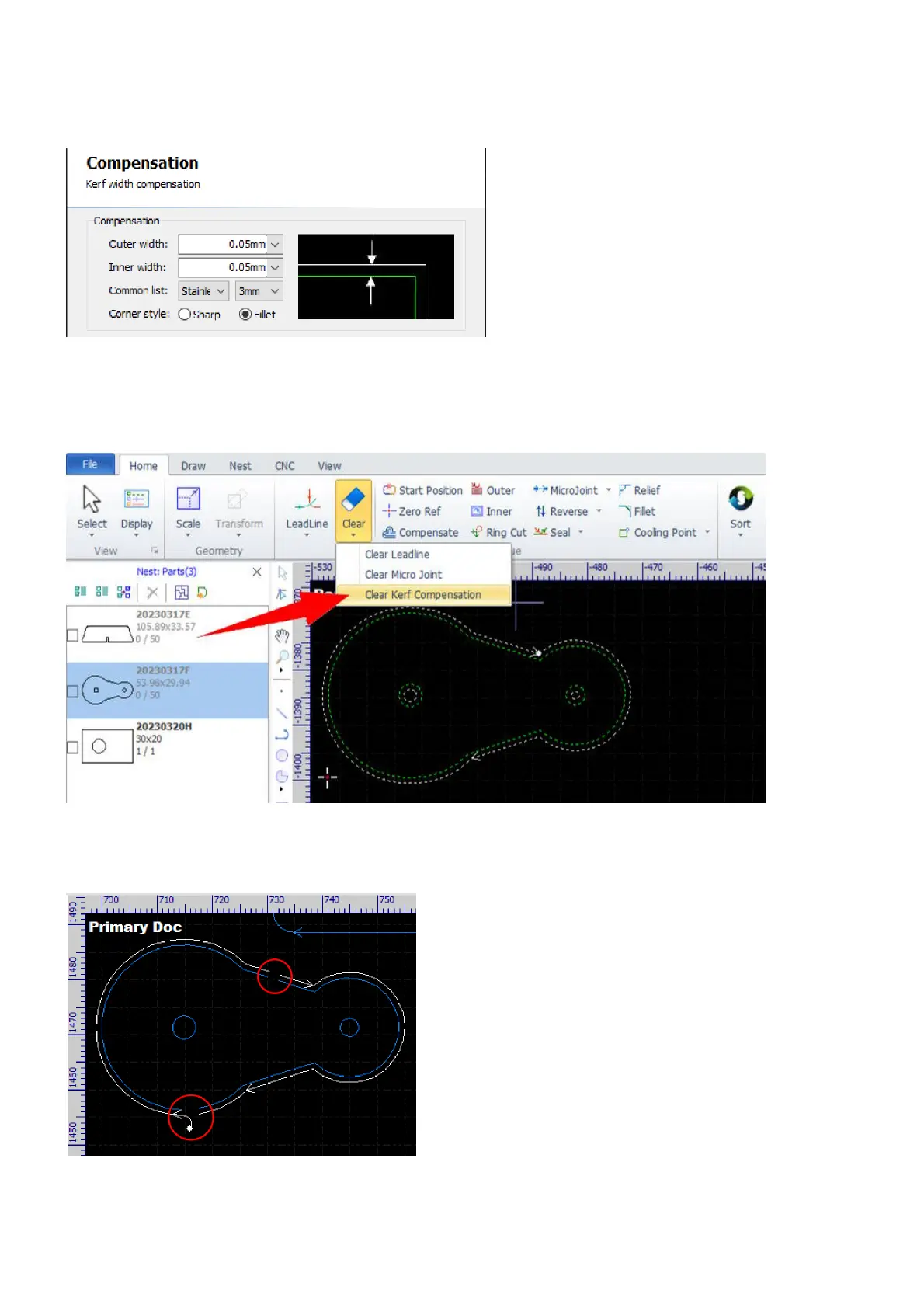 compensation in the dialog or select the command Clear Kerf Compensation in Home>Clear when the