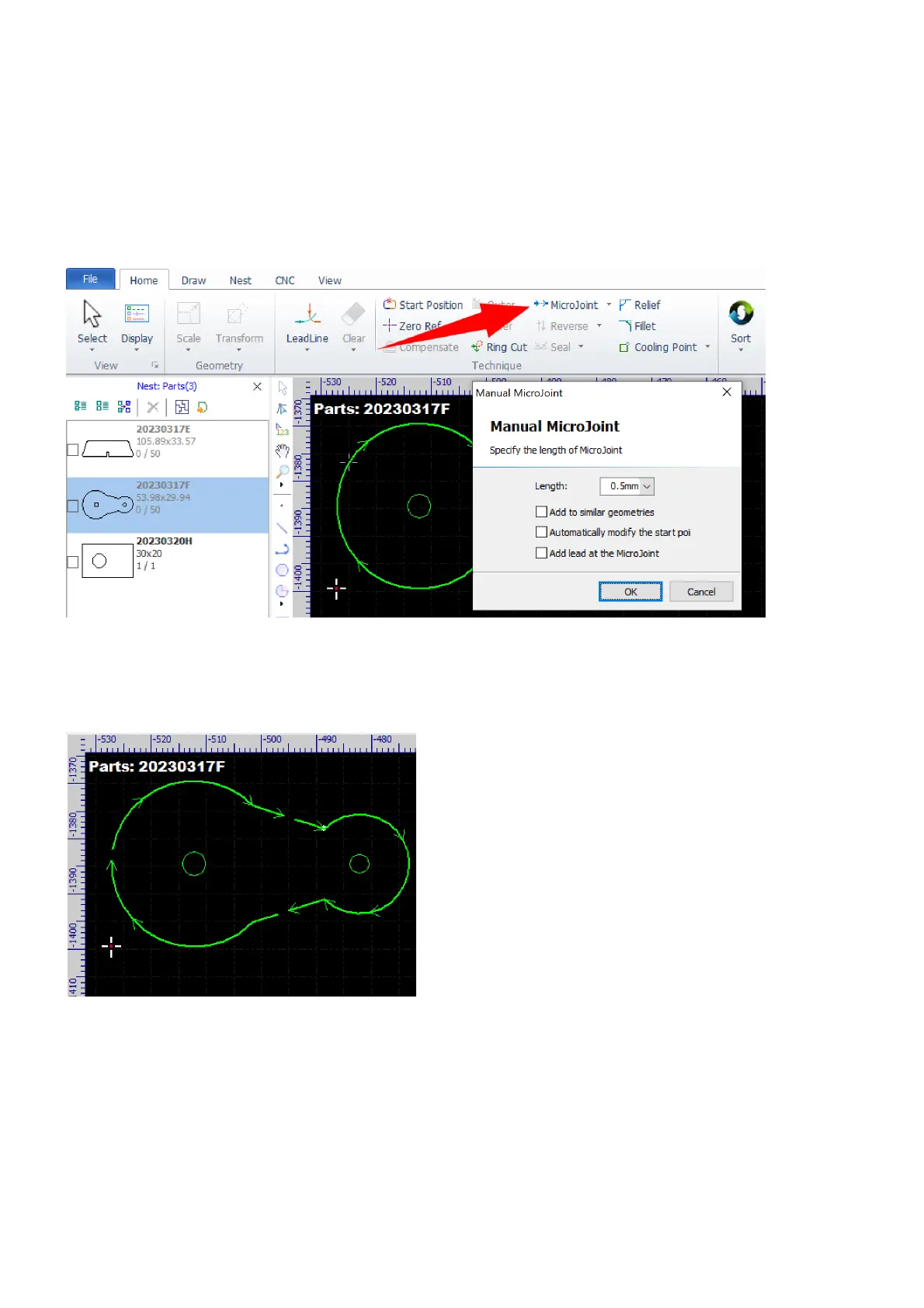 Select the command MicroJoint in Home and then click on the contours to set microjoints.