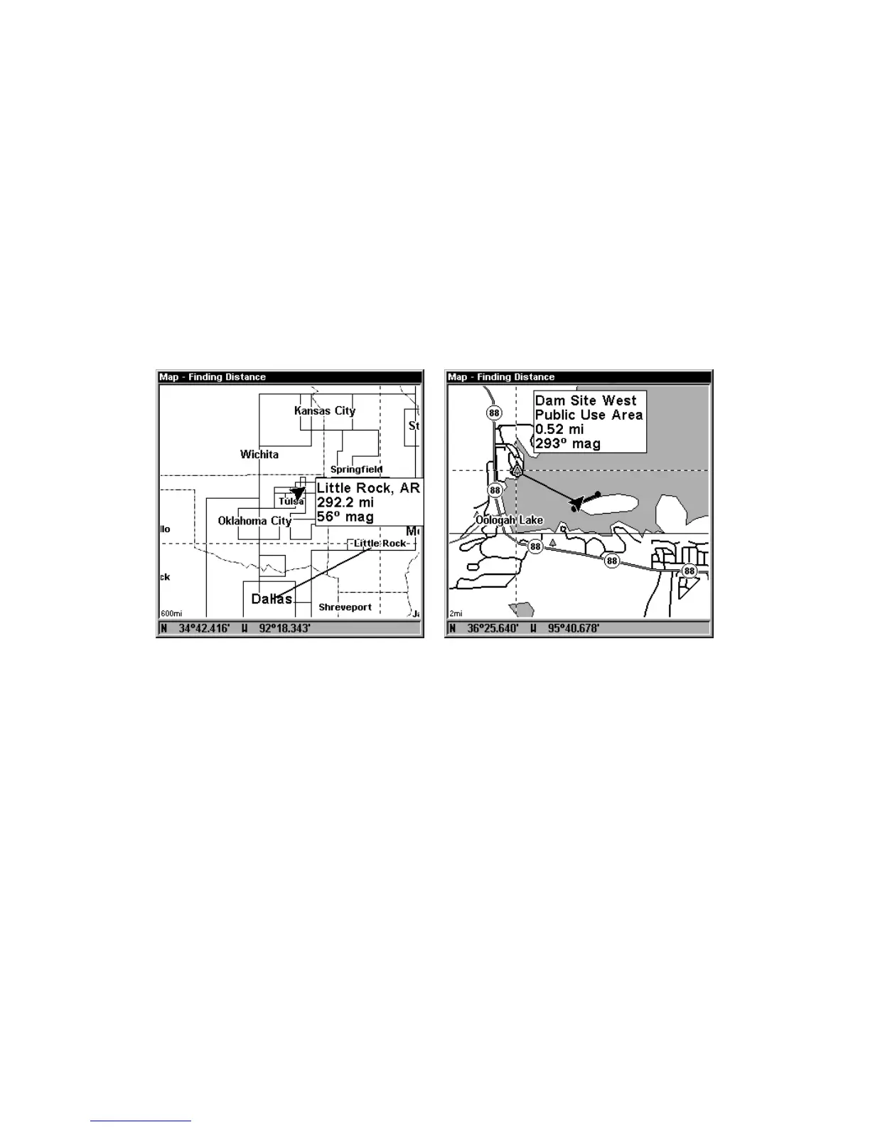 At left, the distance from Dallas to Little Rock is 292.2 miles. At right.