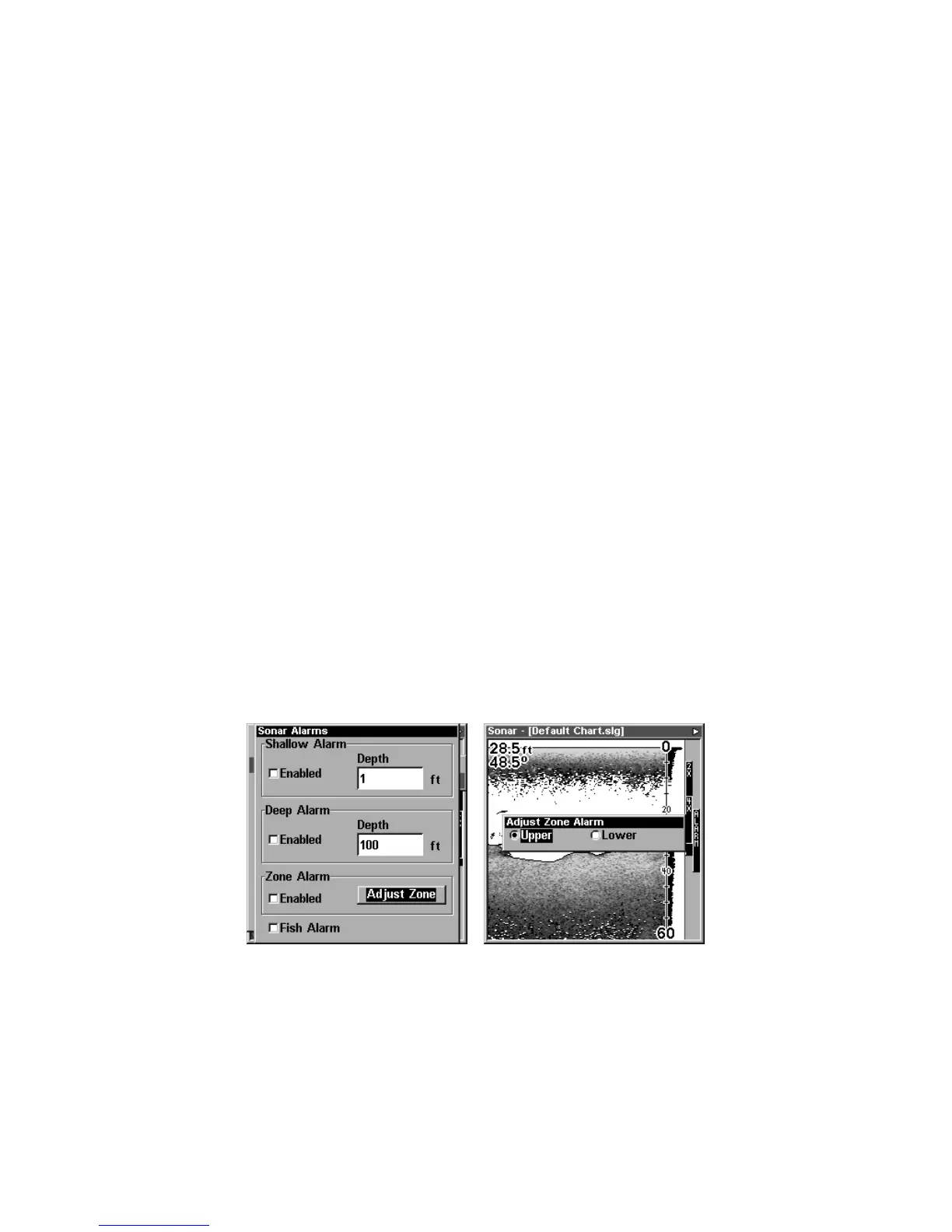 At left, Sonar Alarms menu, with Adjust Zone command selected.