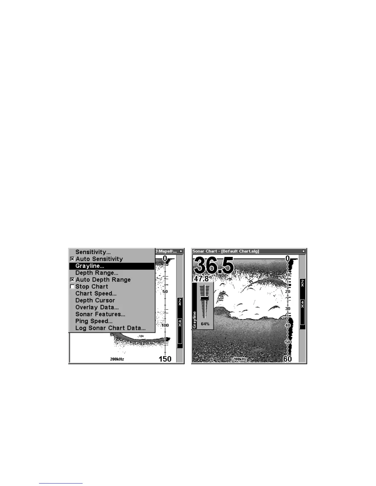 At left, Sonar Page menu with Grayline command selected.