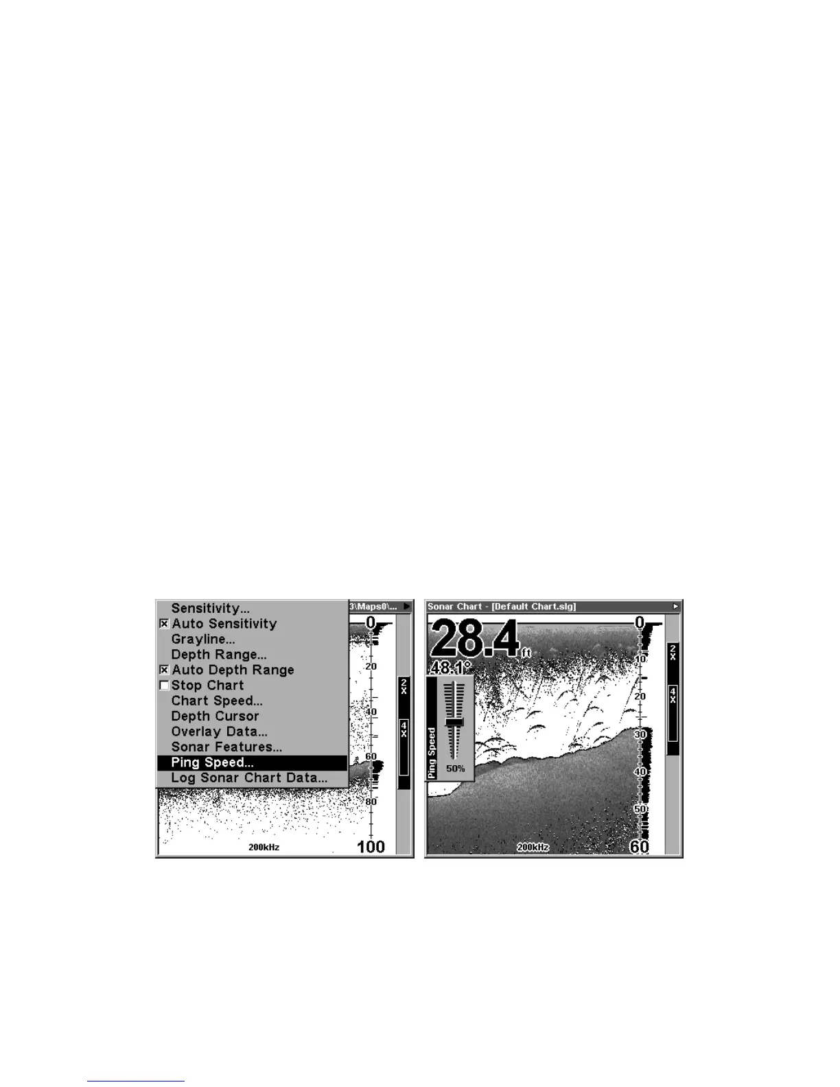 At left, Sonar Menu with Ping Speed command selected.