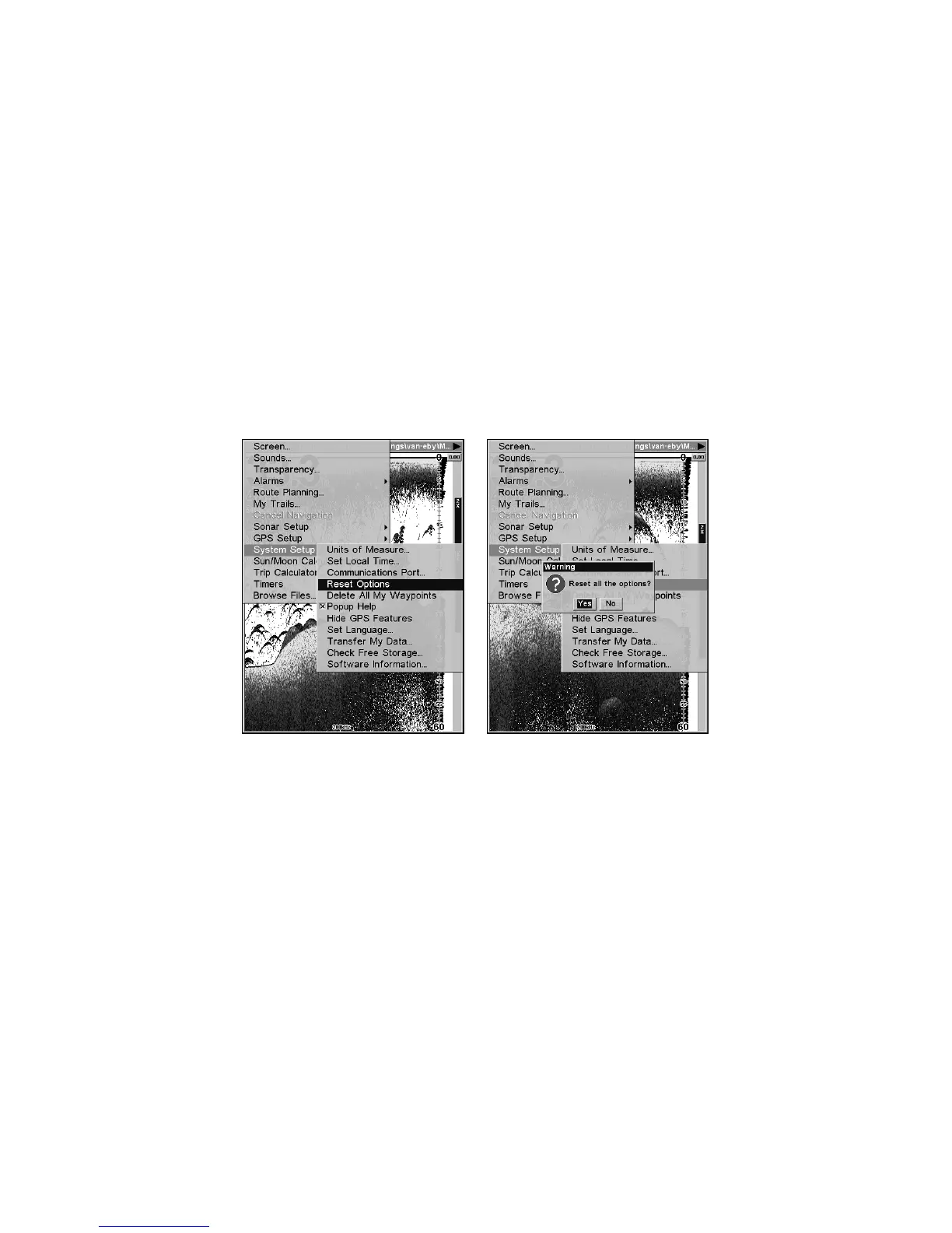 MENU|MENU|↓ to SONAR SETUP|ENT|↓ to RESET WATER DIS-