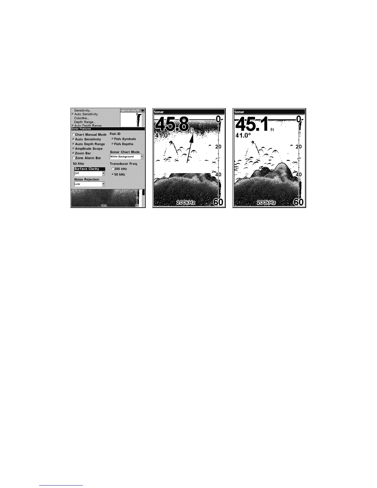 Sonar Features menu with Surface Clarity selected (left). Surface Clar-