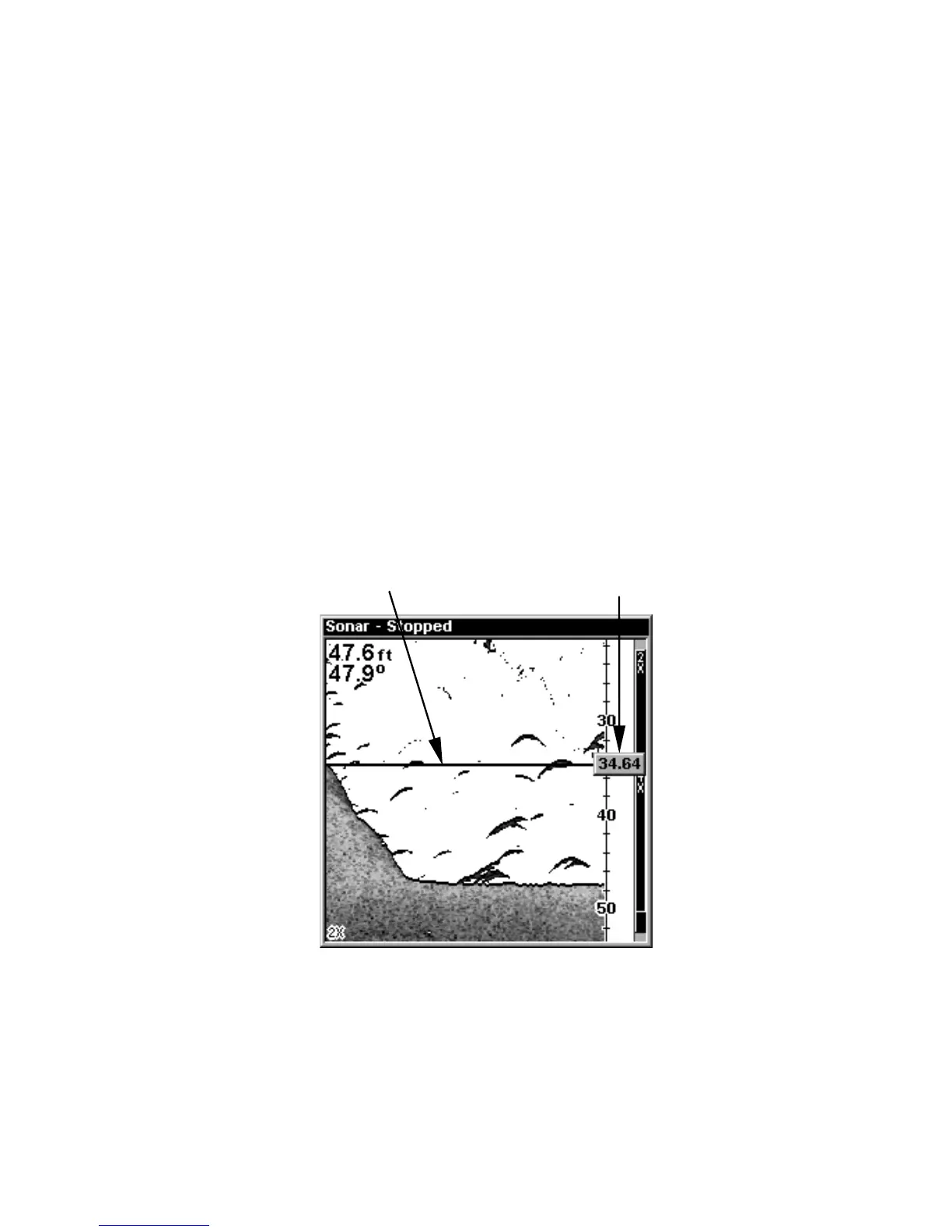 Sonar chart with the depth cursor active. The line indicates