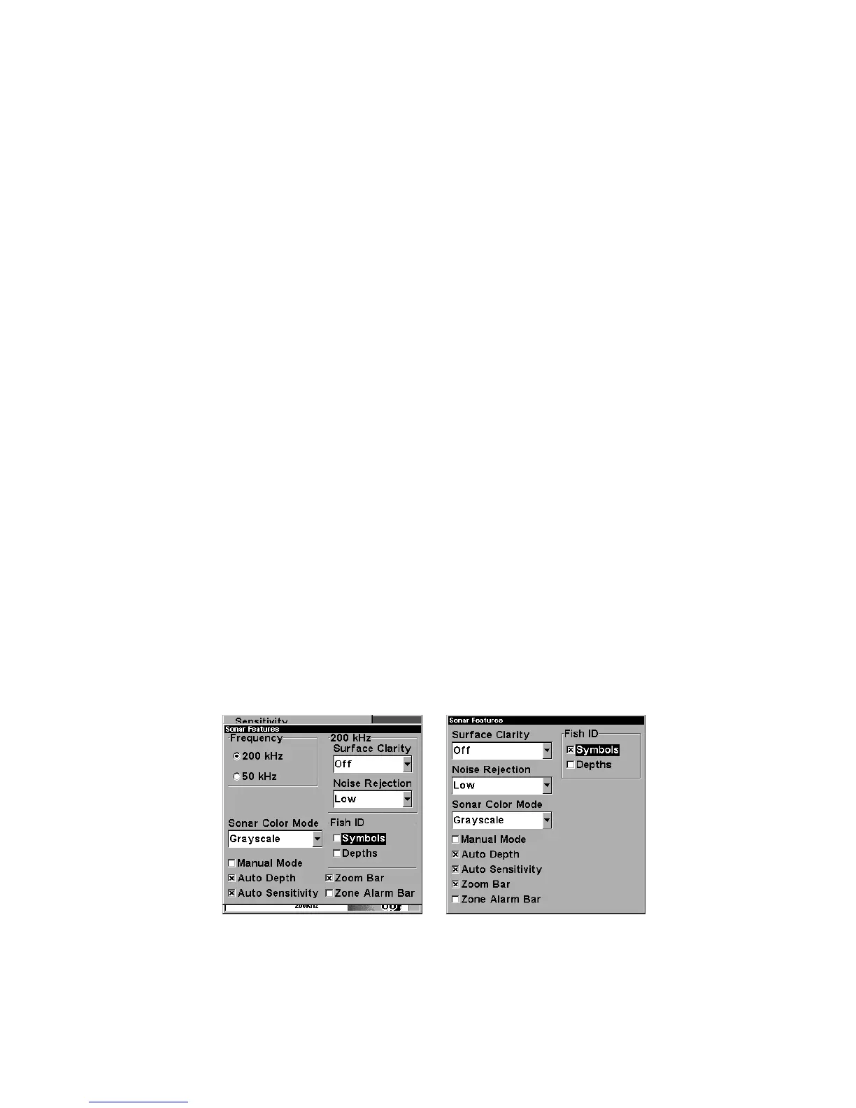 Sonar Features menu with Fish I.D. Symbols selected (at left, dual-