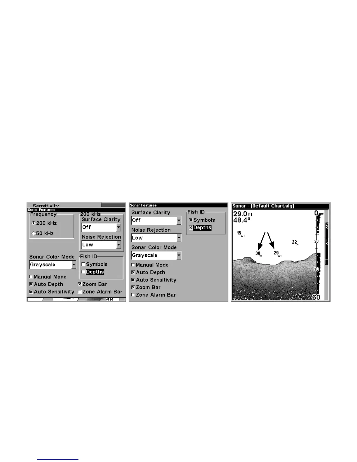 Sonar Features menu with Fish I.D. Depths selected (at left, dual-