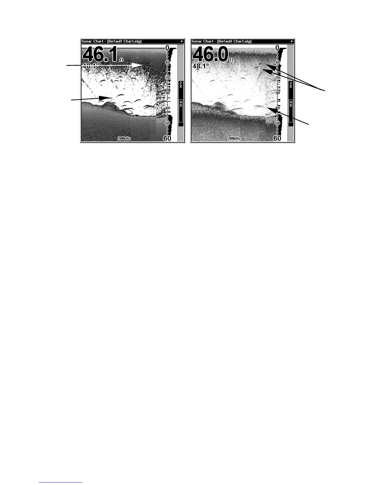 Sonar chart in regular grayscale mode, left, and in FishReveal mode,